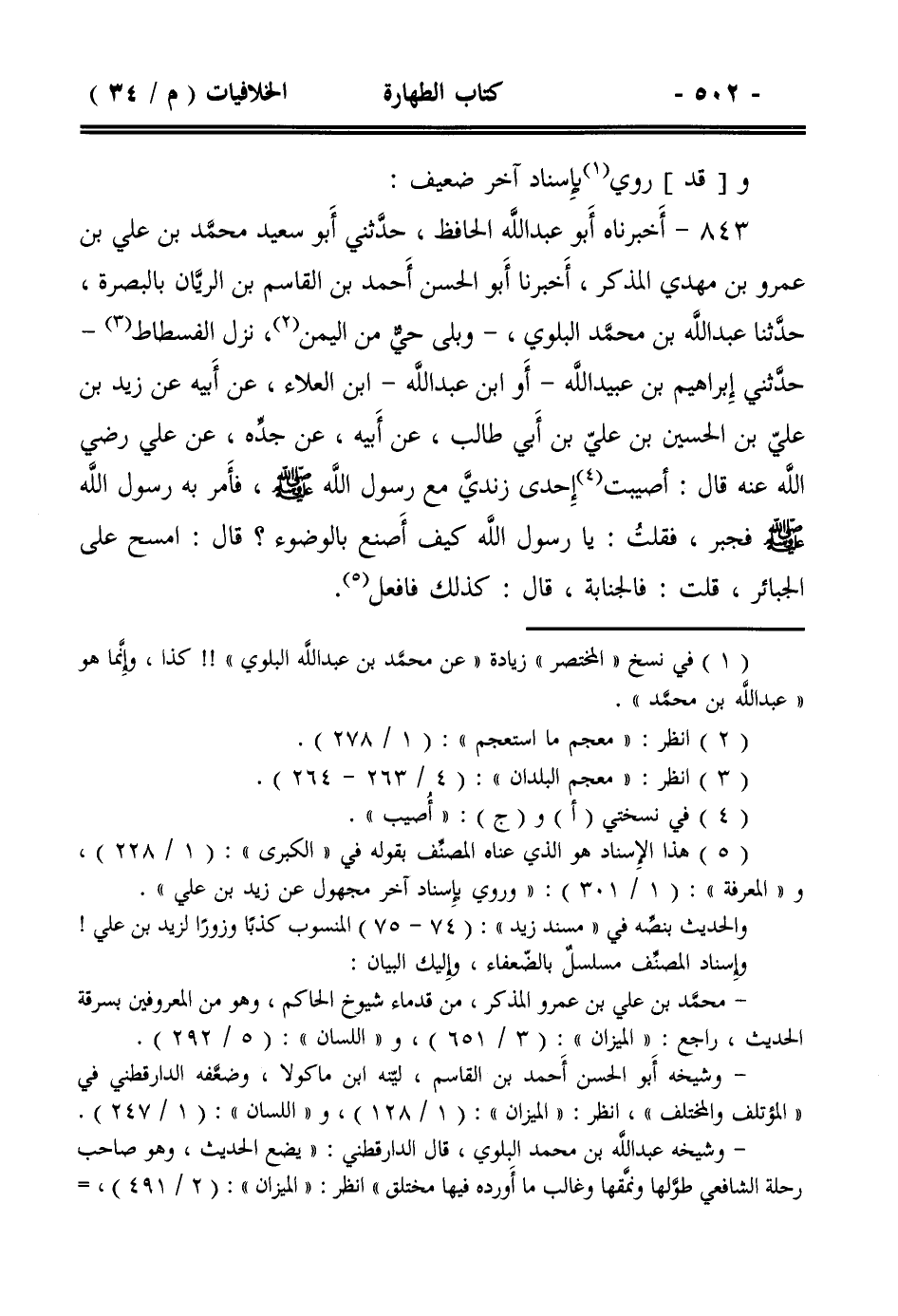 843- أخبرناه أبو عبد الله الحافظ، حدثني أبو سعيد محمد بن علي بن عمرو بن مهدي المذكر، أخبرنا أبو الحسن أحمد بن القاسم بن الريان بالبصرة، حدثنا عبد الله بن محمد البلوي، -وبلى حيٌ من اليمن، نزل الفسطاط- حدثني إبراهيم بن عبيد الله -أو ابن عبد الله- ابن العلاء، عن أبيه عن زيد بن علي بن الحسين بن علي بن أبي طالب، عن أبيه، عن جده، عن علي رضي الله عنه قال: أصيبت إحدى زندي مع رسول الله صلى الله عليه وسلم ، فأمر به رسول الله صلى الله عليه وسلم فجبر، فقلت: يا رسول الله كيف أصنع بالوضوء؟ قال: امسح على الجبائر، قلت: فالجنابة، قال: كذلك فافعل.