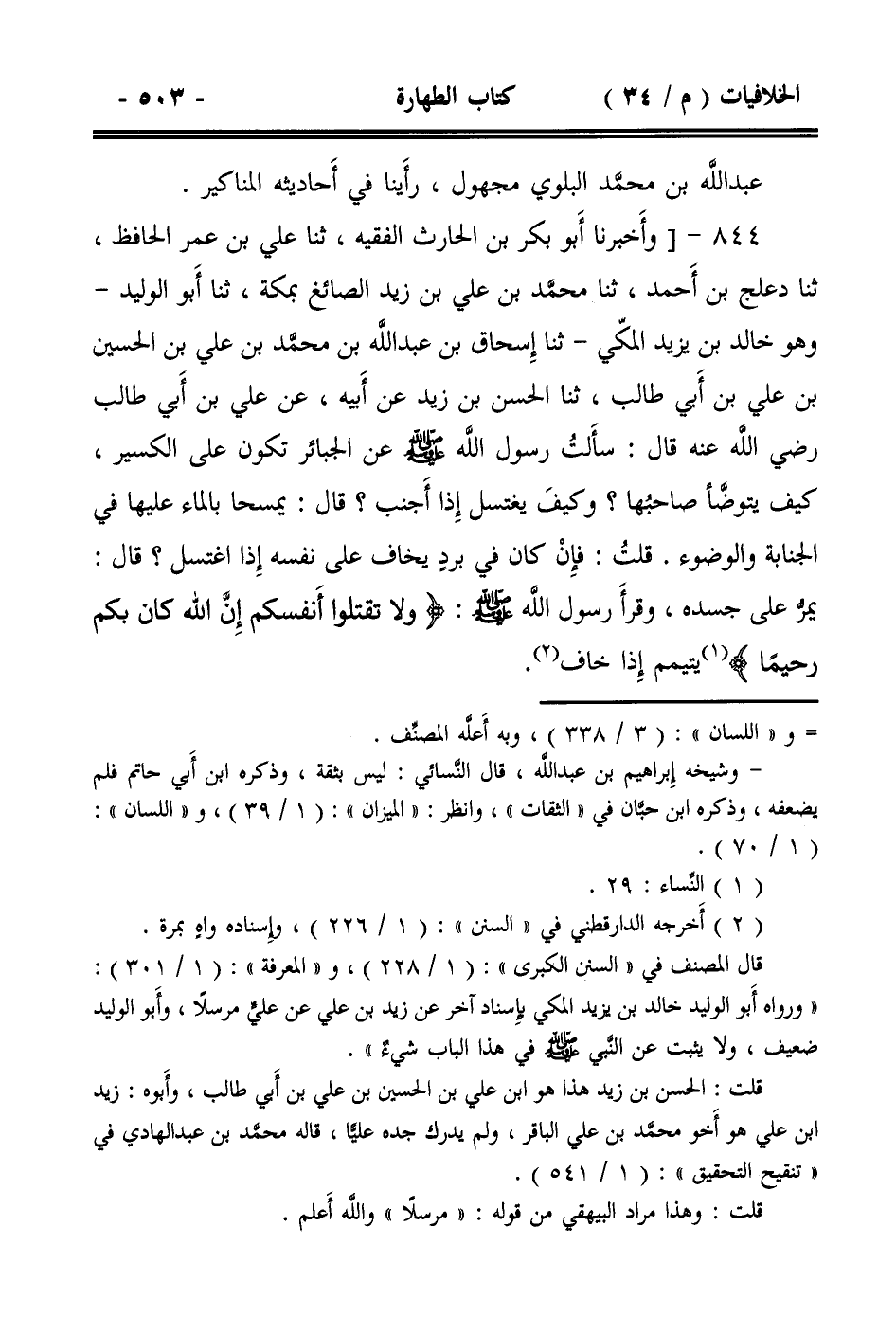 844- [وأخبرنا أبو بكر بن الحارث الفقيه، ثنا علي بن عمر الحافظ، ثنا دعلج بن أحمد، ثنا محمد بن علي بن زيد الصائغ بمكة، ثنا أبو الوليد -وهو خالد بن يزيد المكي- ثنا إسحاق بن عبد الله بن محمد بن علي بن الحسين بن علي بن أبي طالب، ثنا الحسن بن زيد عن أبيه، عن علي بن أبي طالب رضي الله عنه قال: سألت رسول الله صلى الله عليه وسلم عن الجبائر تكون على الكسير، كيف يتوضأ صاحبها؟ وكيف يغتسل إذا أجنب؟ قال: يمسحا بالماء عليها في الجنابة والوضوء. قلت: فإن كان في بردٍ يخاف على نفسه إذا اغتسل؟ قال: يمر على جسده، وقرأ رسول الله صلى الله عليه وسلم : {ولا تقتلوا أنفسكم إن الله كان بكم رحيماً} يتيمم إذا خاف.