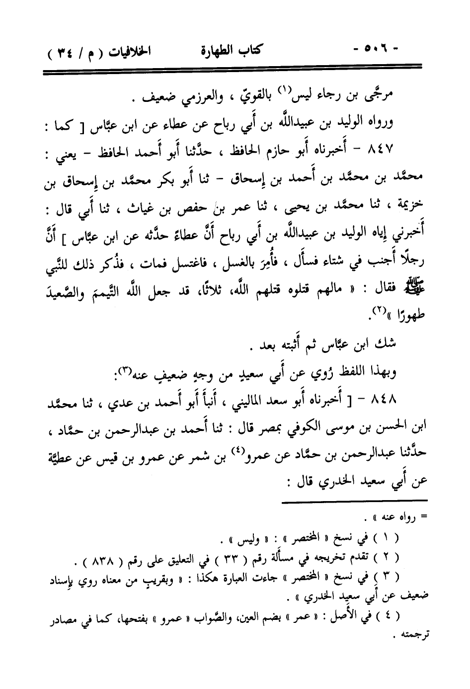 847- أخبرناه أبوحازم الحافظ، حدثنا أبو أحمد الحافظ -يعني: محمد بن محمد بن أحمد بن إسحاق-ثنا أبو بكر محمد بن إسحاق بن خزيمة، ثنا محمد بن يحيى، ثنا عمر بن حفص بن غياث، ثنا أبي قال: أخبرني إياه الوليد بن عبيد الله بن أبي رباح أن عطاءً حدثه عن ابن عباس] أن رجلاً أجنب في شتاء فسأل، فأمر بالغسل، فاغتسل فمات، فذكر ذلك للنبي صلى الله عليه وسلم فقال: ((مالهم قتلوه قتلهم الله، ثلاثاً، قد جعل الله التيمم والصعيد طهوراً)).