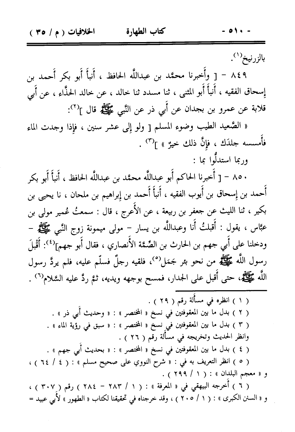 850- [أخبرنا الحاكم أبو عبد الله محمد بن عبد الله الحافظ، أنبأ أبو بكر أحمد بن إسحاق بن أيوب الفقيه، أنبأ أحمد بن إبراهيم بن ملحان، نا يحيى بن بكير، ثنا الليث عن جعفر بن ربيعة، عن الأعرج، قال: سمعت عمير مولى بن عباس، يقول: أقبلت أنا وعبد الله بن يسار -مولى ميمونة زوج النبي صلى الله عليه وسلم -ودخلنا على أبي جهم بن الحارث بن الصمة الأنصاري، فقال أبو جهم]: أقبل رسول الله صلى الله عليه وسلم من نحو بئر جمل، فلقيه رجلٌ فسلم عليه، فلم يرد رسول الله صلى الله عليه وسلم ، حتى أقبل على الجدار، فمسح بوجهه ويديه، ثم رد عليه السلام.