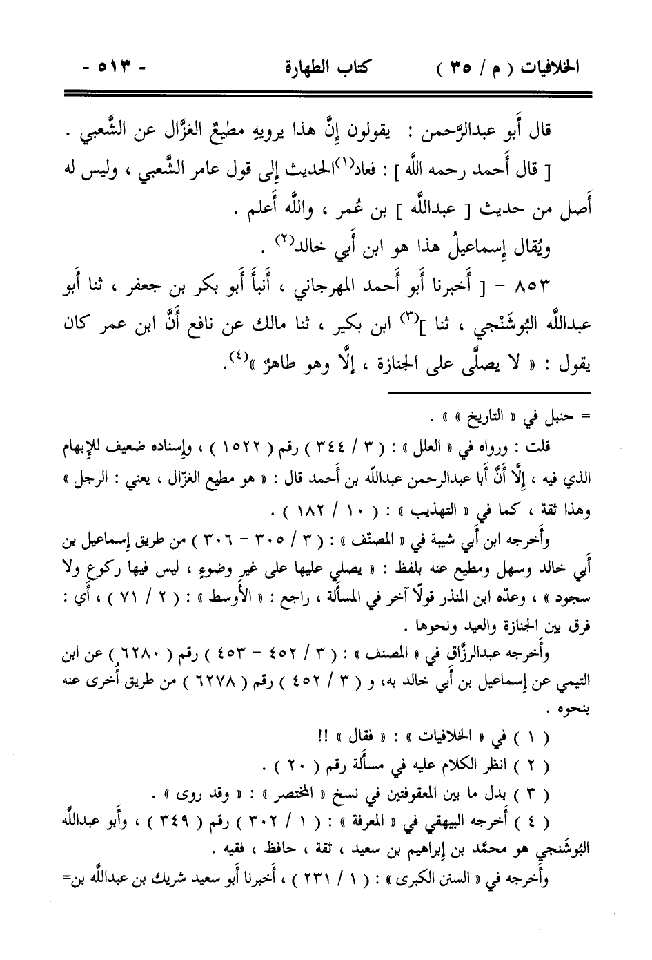 [قال أحمد رحمه الله]: فعاد الحديث إلى قول عامر الشعبي، وليس له أصل من حديث [عبد الله] بن عمر، والله أعلم.