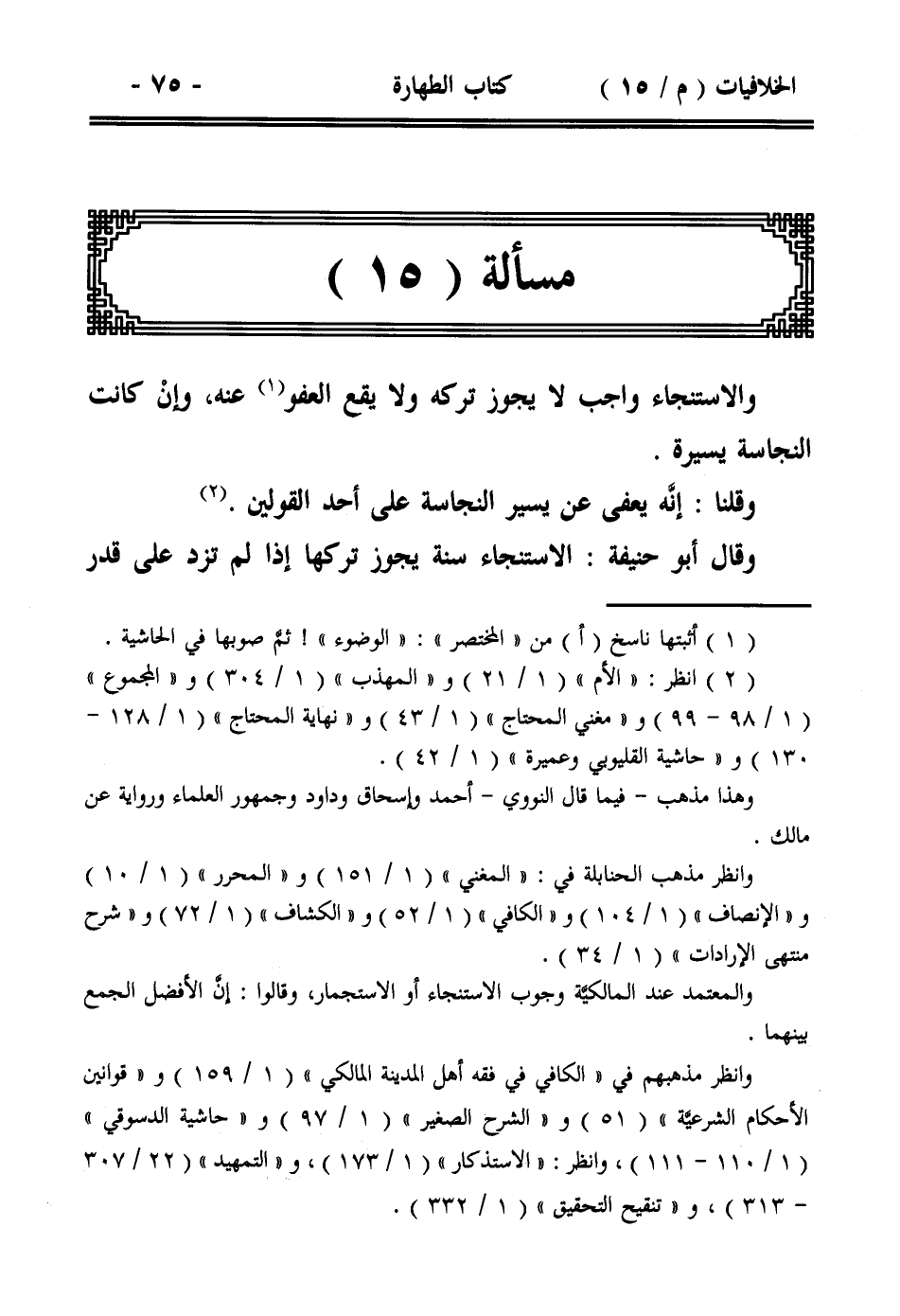 مسألة (15): والاستنجاء واجب لا يجوز تركه ولا يقع العفو عنه، وإن كانت النجاسة يسيرة.