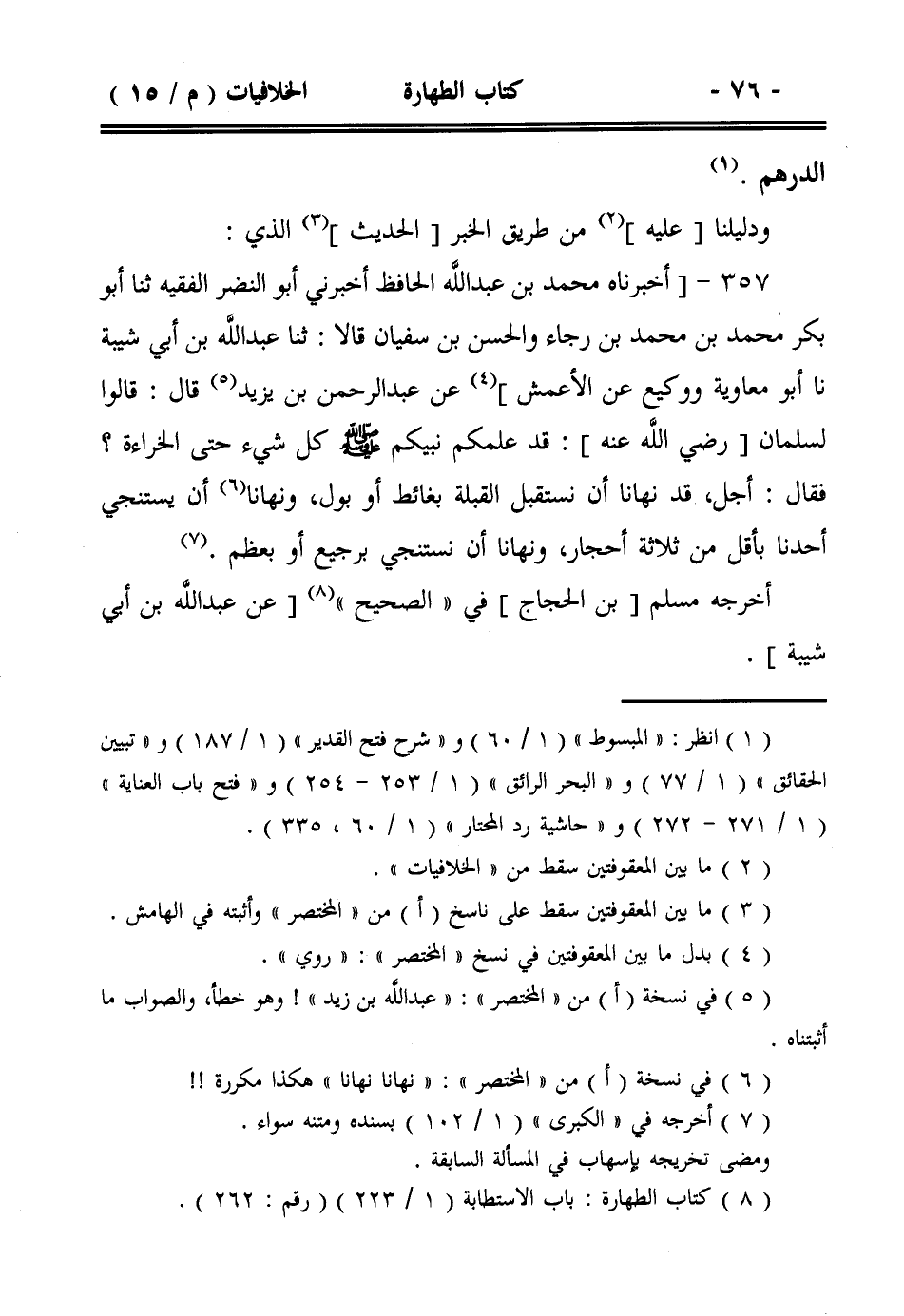 357- [أخبرناه محمد بن عبد الله الحافظ أخبرني أبو النضر الفقيه ثنا أبو بكر محمد بن محمد بن رجاء والحسن بن سفيان قالا: ثنا عبد الله بن أبي شيبة نا أبو معاوية ووكيع عن الأعمش] عن عبد الرحمن بن يزيد قال: قالوا لسلمان [رضي الله عنه]: قد علمكم نبيكم صلى الله عليه وسلم كل شيء حتى الخراءة؟ فقال: أجل، قد نهانا أن نستقبل القبلة بغائط أو بول، ونهانا أن يستنجي أحدنا بأقل من ثلاثة أحجار، ونهانا أن نستنجي برجيع أو بعظم.