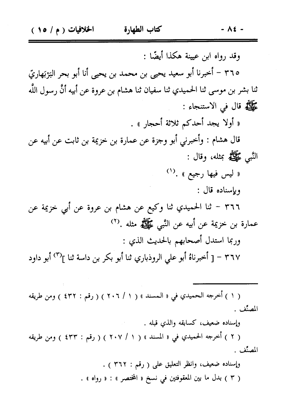 365- أخبرنا أبو سعيد يحيى بن محمد بن يحيى أنا أبو بحر البربهاري ثنا بشر بن موسى ثنا الحميدي ثنا سفيان ثنا هشام بن عروة عن أبيه أن رسول الله صلى الله عليه وسلم قال في الاستنجاء: