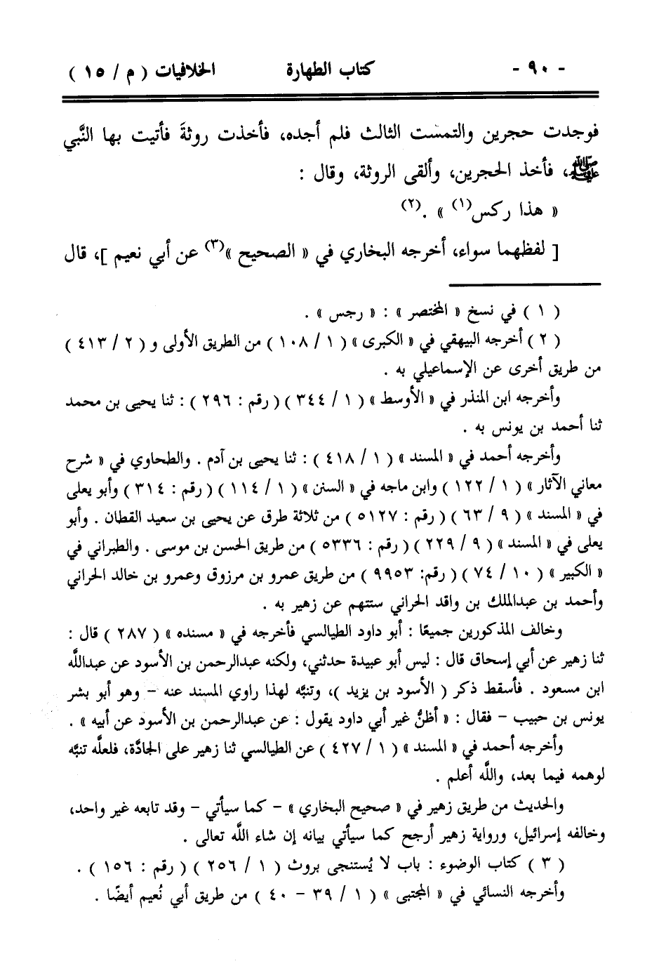 فوجدت حجرين والتمست الثالث فلم أجده، فأخذت روثة فأتيت بها النبي صلى الله عليه وسلم ، فأخذ الحجرين، وألقى الروثة، وقال: