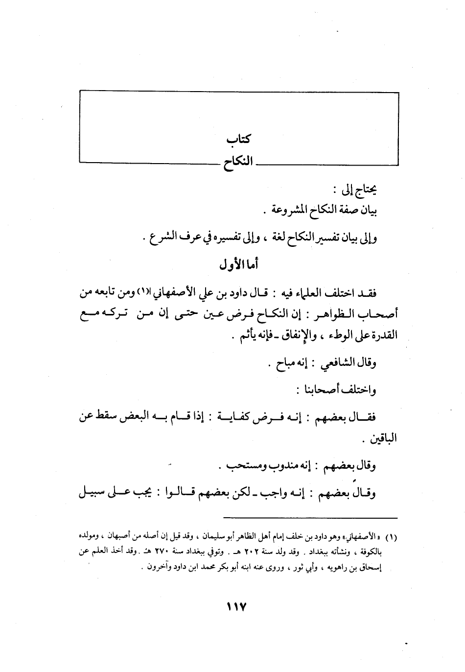أما الأول فقد اخْتلف الْعلمَاء فِيهِ قَالَ دَاوُد بن عَليّ الْأَصْفَهَانِي وَمن تَابعه من أَصْحَاب الظَّوَاهِر إِن النِّكَاح فرض عين حَتَّى إِن من تَركه مَعَ الْقُدْرَة على الْوَطْء والإنفاق فَإِنَّهُ يَأْثَم