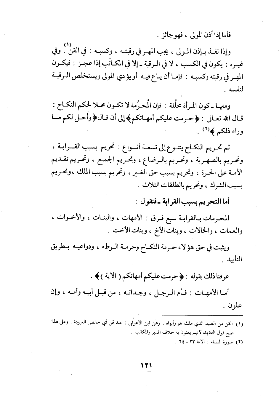 أما التَّحْرِيم بِسَبَب الْقَرَابَة فَنَقُول الْمُحرمَات بِالْقَرَابَةِ سبع فرق الْأُمَّهَات وَالْبَنَات وَالْأَخَوَات والعمات والخالات وَبَنَات الْأَخ وَبَنَات الْأُخْت