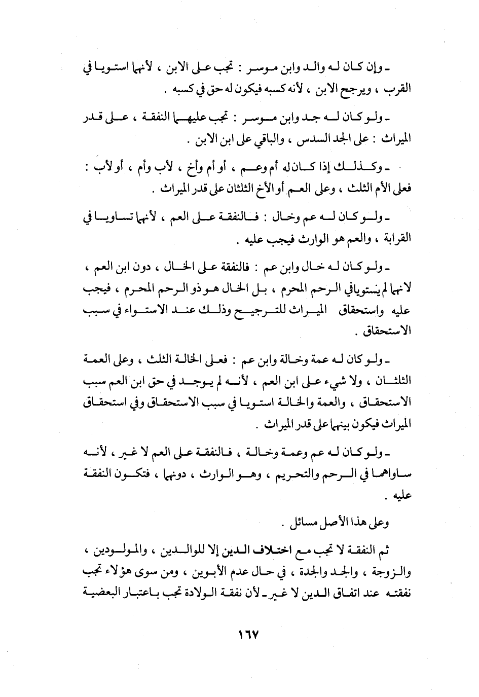 ثمَّ النَّفَقَة لَا تجب مَعَ اخْتِلَاف الدّين إِلَّا للْوَالِدين والمولودين وَالزَّوْجَة وَالْجد وَالْجدّة فِي حَال عدم الْأَبَوَيْنِ وَمن سوى هَؤُلَاءِ تجب نَفَقَته عِنْد اتِّفَاق الدّين لَا غير لِأَن نَفَقَة الْولادَة تجب بِاعْتِبَار البعضية