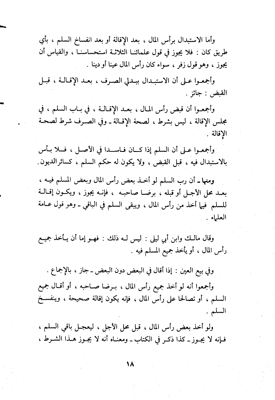وَأما الِاسْتِبْدَال بِرَأْس المَال بعد الْإِقَالَة أَو بعد انْفِسَاخ السّلم بِأَيّ طَرِيق كَانَ فَلَا يجوز فِي قَول عُلَمَائِنَا الثَّلَاثَة اسْتِحْسَانًا وَالْقِيَاس أَن يجوز وَهُوَ قَول زفر سَوَاء كَانَ رَأس المَال عينا أَو دينا