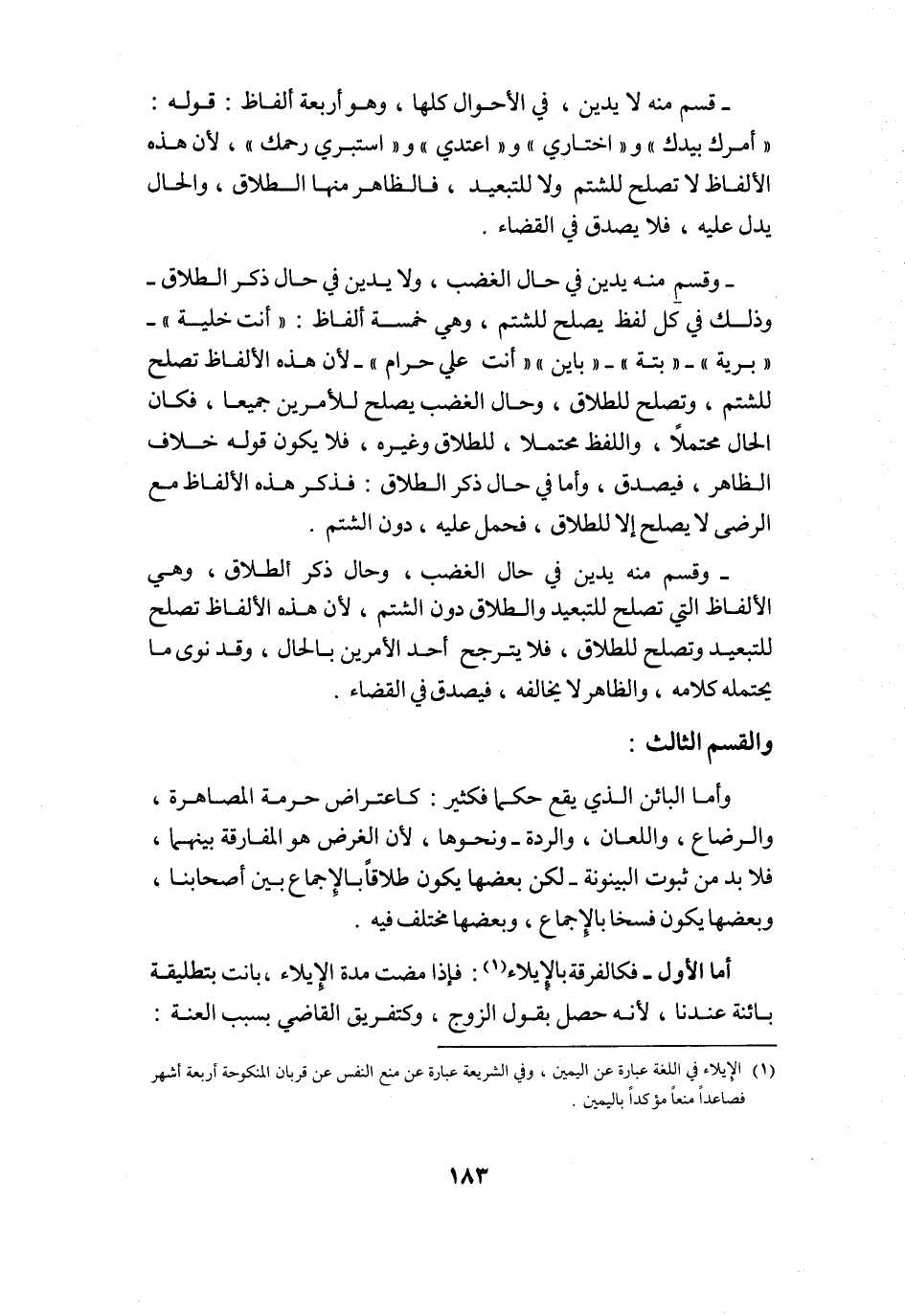 وَقسم مِنْهُ يدين فِي حَال الْغَضَب وَلَا يدين فِي حَال ذكر الطَّلَاق وَذَلِكَ فِي كل لفظ يصلح للشتم وَهِي خَمْسَة أَلْفَاظ أَنْت خلية بَريَّة بتة باين أَنْت عَليّ حرَام لِأَن هَذِه الْأَلْفَاظ تصلح للشتم وَتصْلح للطَّلَاق وَحَال الْغَضَب يصلح للأمرين جَمِيعًا فَكَانَ الْحَال مُحْتملا وَاللَّفْظ مُحْتملا للطَّلَاق وَغَيره فَلَا يكون قَوْله خلاف الظَّاهِر فَيصدق وَأما فِي حَال ذكر الطَّلَاق فَذكر هَذِه الْأَلْفَاظ مَعَ الرضى لَا يصلح إِلَّا للطَّلَاق فَحمل عَلَيْهِ دون الشتم