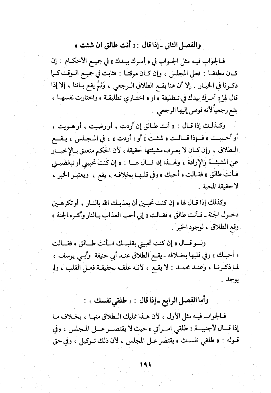 الْفَصْل الثَّانِي إِذا قَالَ أَنْت طَالِق إِن شِئْت فَالْجَوَاب فِيهِ مثل الْجَواب فِي أَمرك بِيَدِك فِي جَمِيع الْأَحْكَام إِن كَانَ مُطلقًا فعلى الْمجْلس وَإِن كَانَ مؤقتا فثابت فِي جَمِيع الْوَقْت كَمَا ذكرنَا فِي الْخِيَار