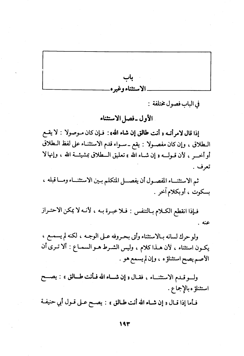 وَغَيره فِي الْبَاب فُصُول مُخْتَلفَة الأول فصل الِاسْتِثْنَاء إِذا قَالَ لامْرَأَته أَنْت طَالِق إِن شَاءَ الله فَإِن كَانَ مَوْصُولا لَا يَقع الطَّلَاق وَإِن كَانَ مَفْصُولًا يَقع سَوَاء قدم الِاسْتِثْنَاء على لفظ الطَّلَاق أَو أخر لِأَن قَوْله إِن شَاءَ الله تَعْلِيق الطَّلَاق بِمَشِيئَة الله وَإِنَّهَا لَا تعرف