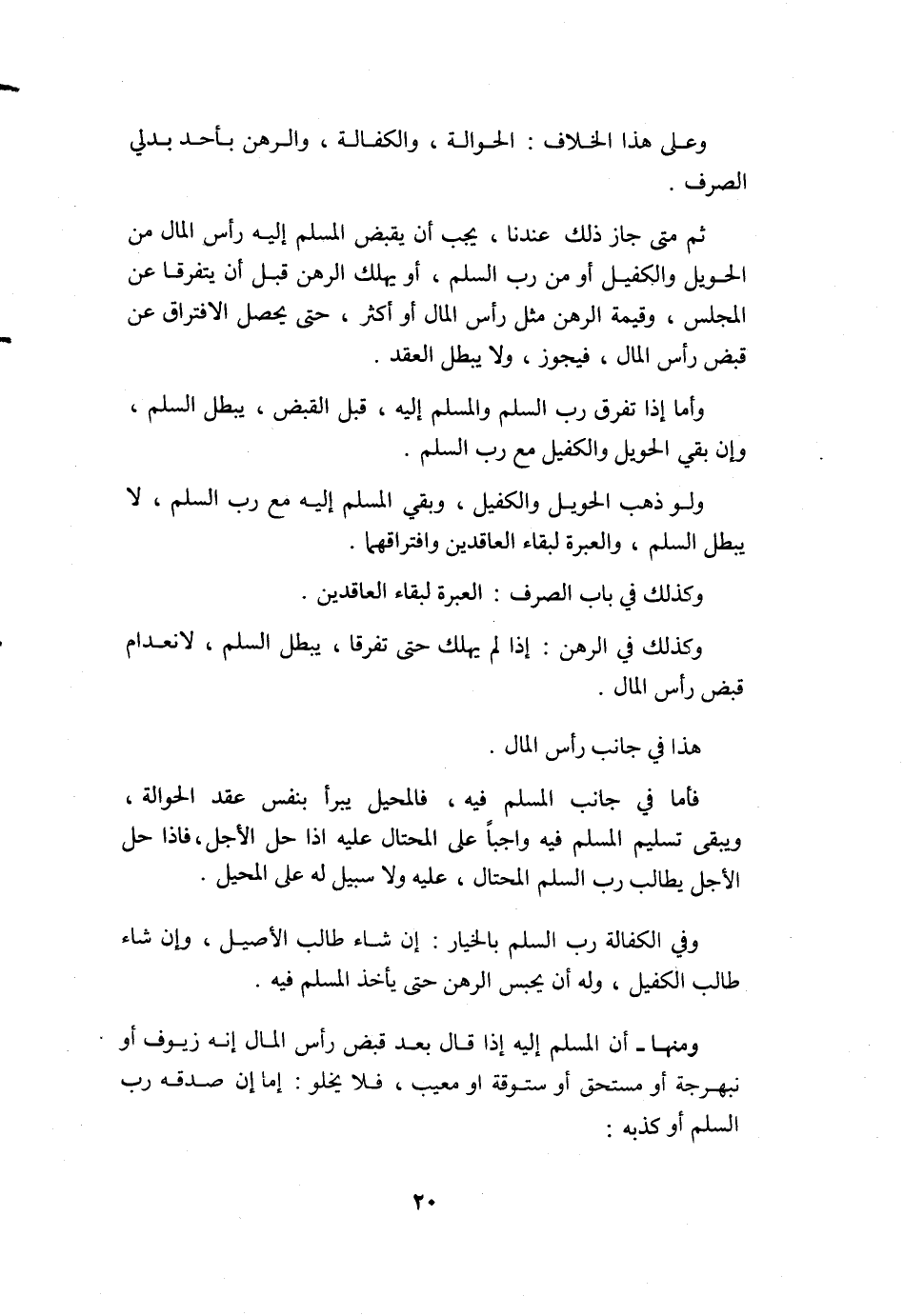 ثمَّ مَتى جَازَ ذَلِك عندنَا يجب أَن يقبض الْمُسلم إِلَيْهِ رَأس المَال من الحويل وَالْكَفِيل أَو من رب السّلم أَو يهْلك الرَّهْن قبل أَن يَتَفَرَّقَا عَن الْمجْلس وَقِيمَة الرَّهْن مثل رَأس المَال أَو أَكثر حَتَّى يحصل الِافْتِرَاق عَن قبض رَأس المَال فَيجوز وَلَا يبطل العقد