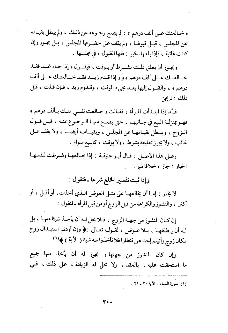 خالعتك على ألف دِرْهَم لم يَصح رُجُوعه عَن ذَلِك وَلم يبطل بقيامه عَن الْمجْلس قبل قبُولهَا وَلم يقف على حضرتها الْمجْلس بل يجوز وَإِن كَانَت غَائِبَة فَإِذا بلغَهَا الْخَبَر فلهَا الْقبُول فِي مجلسها
