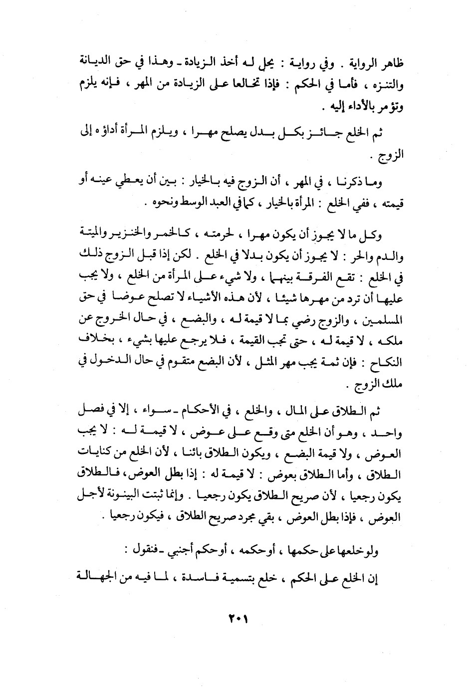 ثمَّ الطَّلَاق على المَال وَالْخلْع فِي الْأَحْكَام سَوَاء إِلَّا فِي فصل وَاحِد وَهُوَ أَن الْخلْع مَتى وَقع على عوض لَا قيمَة لَهُ لَا يجب الْعِوَض وَلَا قيمَة الْبضْع وَيكون الطَّلَاق بَائِنا لِأَن الْخلْع من كنايات الطَّلَاق وَأما الطَّلَاق بعوض لَا قيمَة لَهُ إِذا بَطل الْعِوَض فالطلاق يكون رَجْعِيًا لِأَن صَرِيح الطَّلَاق يكون رَجْعِيًا