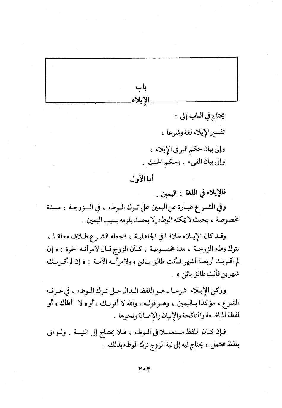 يحْتَاج فِي الْبَاب إِلَى تَفْسِير الْإِيلَاء لُغَة وَشرعا وَإِلَى بَيَان حكم الْبر فِي الْإِيلَاء وَإِلَى بَيَان الْفَيْء وَحكم الْحِنْث