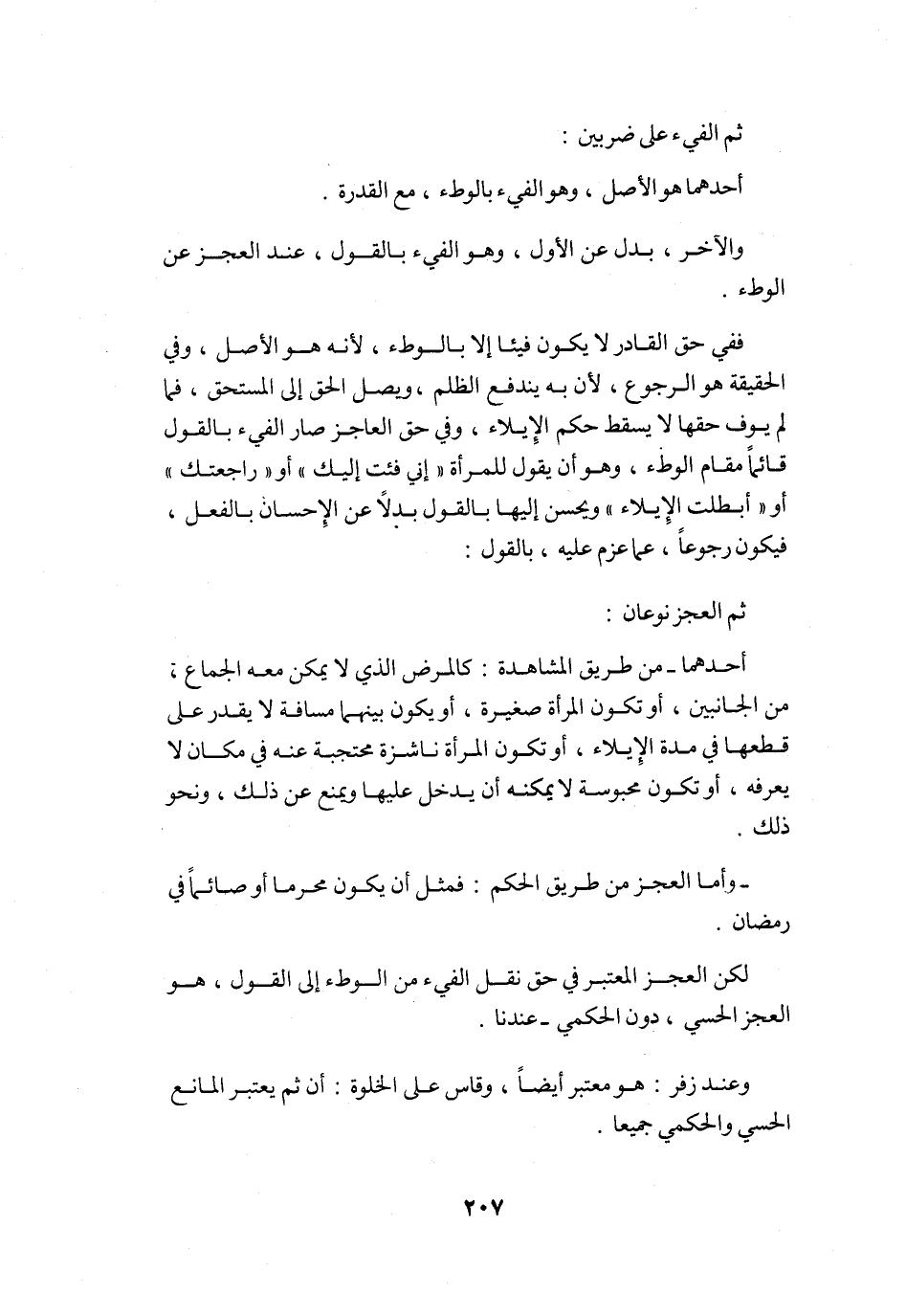 فَفِي حق الْقَادِر لَا يكون فَيْئا إِلَّا بِالْوَطْءِ لِأَنَّهُ هُوَ الأَصْل وَفِي الْحَقِيقَة هُوَ الرُّجُوع لِأَن بِهِ ينْدَفع الظُّلم ويصل الْحق إِلَى الْمُسْتَحق فَمَا لم يوف حَقّهَا لَا يسْقط حكم الْإِيلَاء وَفِي حق الْعَاجِز صَار الْفَيْء بالْقَوْل قَائِما مقَام الْوَطْء وَهُوَ أَن يَقُول للْمَرْأَة إِنِّي فئت إِلَيْك أَو رَاجَعتك أَو أبطلت الْإِيلَاء وَيحسن إِلَيْهَا بالْقَوْل بَدَلا عَن الْإِحْسَان بِالْفِعْلِ فَيكون رُجُوعا عَمَّا عزم عَلَيْهِ بالْقَوْل ثمَّ الْعَجز نَوْعَانِ أَحدهمَا من طَرِيق الْمُشَاهدَة كالمرض الَّذِي لَا يُمكن مَعَه الْجِمَاع من الْجَانِبَيْنِ أَو تكون الْمَرْأَة صَغِيرَة أَو يكون بَينهمَا مَسَافَة لَا يقدر على قطعهَا فِي مُدَّة الْإِيلَاء أَو تكون الْمَرْأَة نَاشِزَة محتجبة عَنهُ فِي مَكَان لَا يعرفهُ أَو تكون محبوسة لَا يُمكنهُ أَن يدْخل عَلَيْهَا وَيمْنَع عَن ذَلِك وَنَحْو ذَلِك