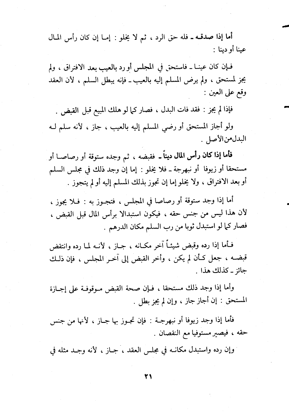 فَأَما إِذا كَانَ رَأس المَال دينا فَقَبضهُ ثمَّ وجده ستوقة أَو رصاصا أَو مُسْتَحقّا أَو زُيُوفًا أَو نبهرجة فَلَا يَخْلُو إِمَّا إِن وجد ذَلِك فِي مجْلِس السّلم أَو بعد الِافْتِرَاق وَلَا يَخْلُو إِمَّا إِن تجوز بذلك الْمُسلم إِلَيْهِ أَو لم يتجوز