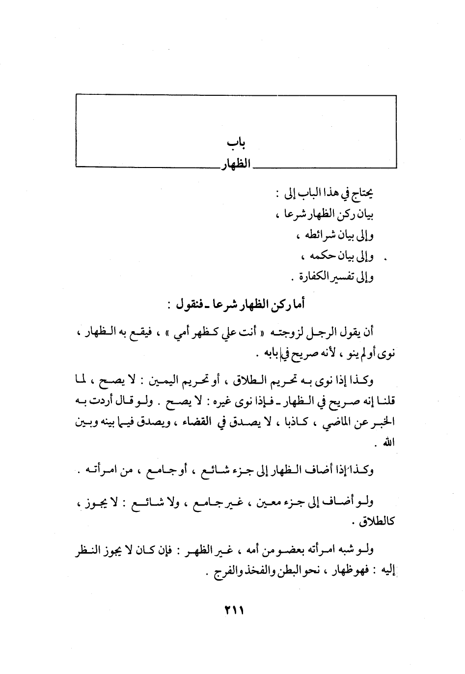 يحْتَاج فِي هَذَا الْبَاب إِلَى بَيَان ركن الظِّهَار شرعا وَإِلَى بَيَان شَرَائِطه وَإِلَى بَيَان حكمه وَإِلَى تَفْسِير الْكَفَّارَة