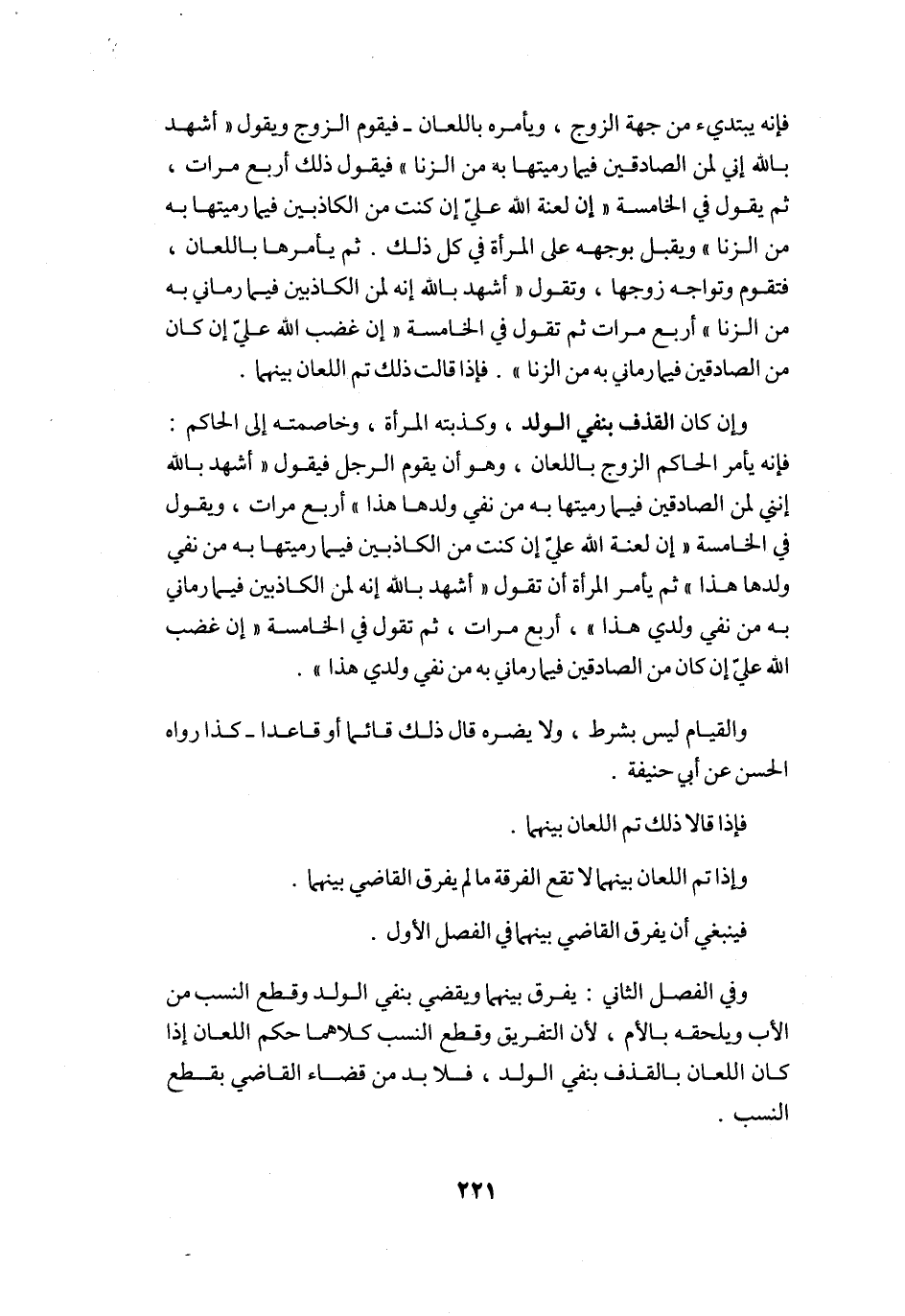 وَإِن كَانَ الْقَذْف بِنَفْي الْوَلَد وكذبته الْمَرْأَة وخاصمته إِلَى الْحَاكِم فَإِنَّهُ يَأْمر الْحَاكِم الزَّوْج بِاللّعانِ وَهُوَ أَن يقوم الرجل فَيَقُول أشهد بِاللَّه إِنَّنِي لمن الصَّادِقين فِيمَا رميتها بِهِ من نفي وَلَدهَا هَذَا أَربع مَرَّات وَيَقُول فِي الْخَامِسَة إِن لعنة الله عَليّ إِن كنت من الْكَاذِبين فِيمَا رميتها بِهِ من نفي وَلَدهَا هَذَا ثمَّ يَأْمر الْمَرْأَة أَن تَقول أشهد بِاللَّه إِنَّه لمن الْكَاذِبين فِيمَا رماني بِهِ من نفي وَلَدي هَذَا أَربع مَرَّات ثمَّ تَقول فِي الْخَامِسَة إِن غضب الله عَليّ إِن كَانَ من الصَّادِقين فِيمَا رماني بِهِ من نفي وَلَدي هَذَا