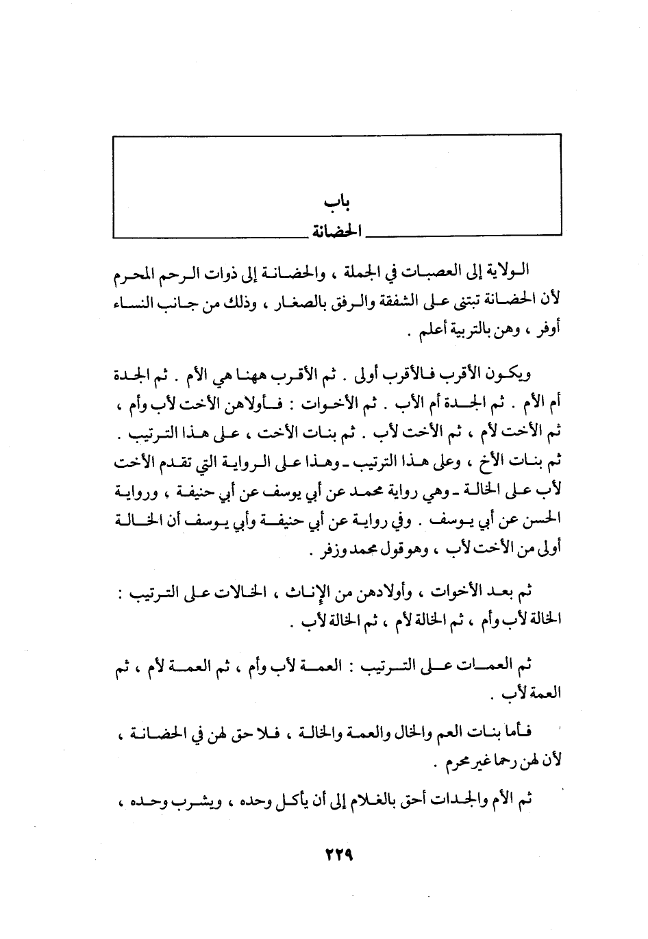 ثمَّ الْأَقْرَب هَهُنَا هِيَ الْأُم ثمَّ الْجدّة أم الْأُم ثمَّ الْجدّة أم الْأَب ثمَّ الْأَخَوَات فأولاهن الْأُخْت لأَب وَأم ثمَّ الْأُخْت لأم ثمَّ الْأُخْت لأَب ثمَّ بَنَات الْأُخْت على هَذَا التَّرْتِيب ثمَّ بَنَات الْأَخ وعَلى هَذَا التَّرْتِيب وَهَذَا على الرِّوَايَة الَّتِي تقدم الْأُخْت لأَب على الْخَالَة وَهِي رِوَايَة مُحَمَّد عَن أبي يُوسُف عَن أبي حنيفَة وَرِوَايَة الْحسن عَن أبي يُوسُف