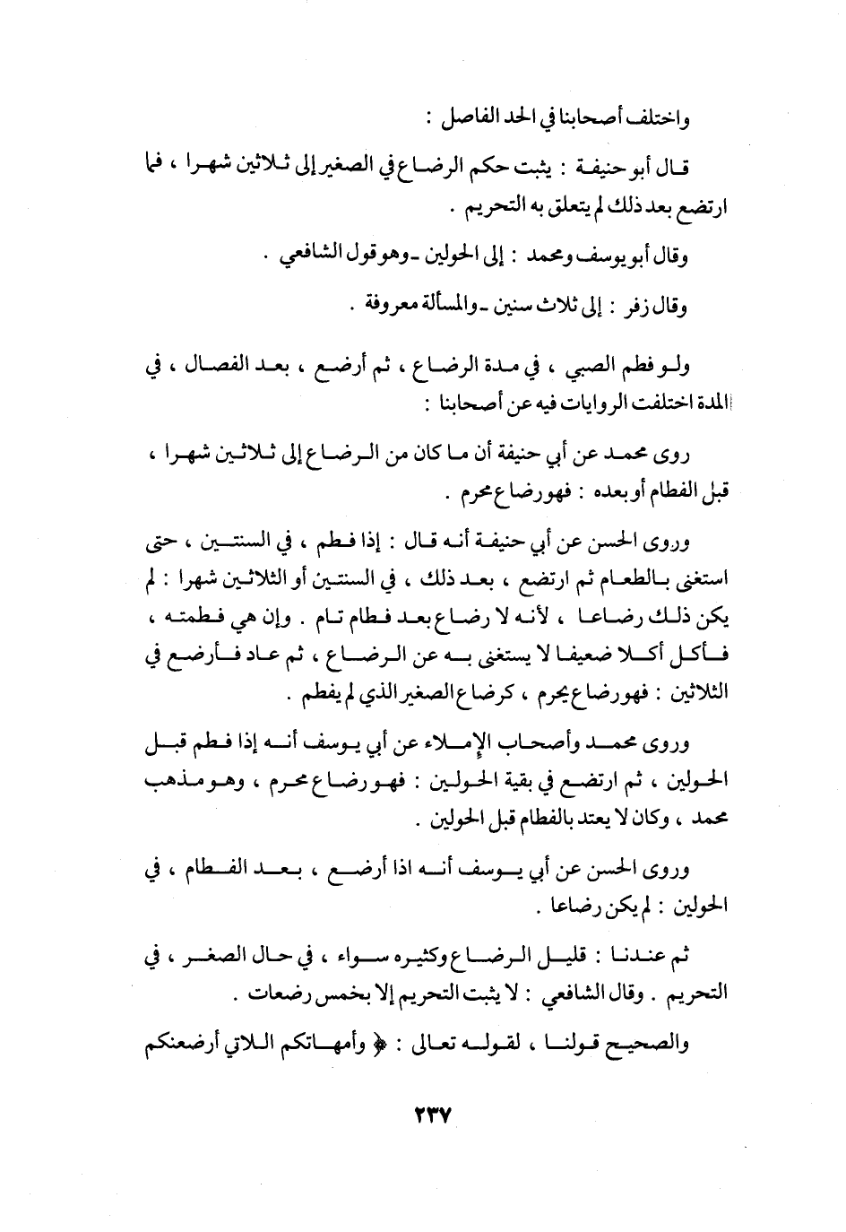 وَاخْتلف أَصْحَابنَا فِي الْحَد الْفَاصِل قَالَ أَبُو حنيفَة يثبت حكم الرَّضَاع فِي الصَّغِير إِلَى ثَلَاثِينَ شهرا فَمَا ارتضع بعد ذَلِك لم يتَعَلَّق بِهِ التَّحْرِيم