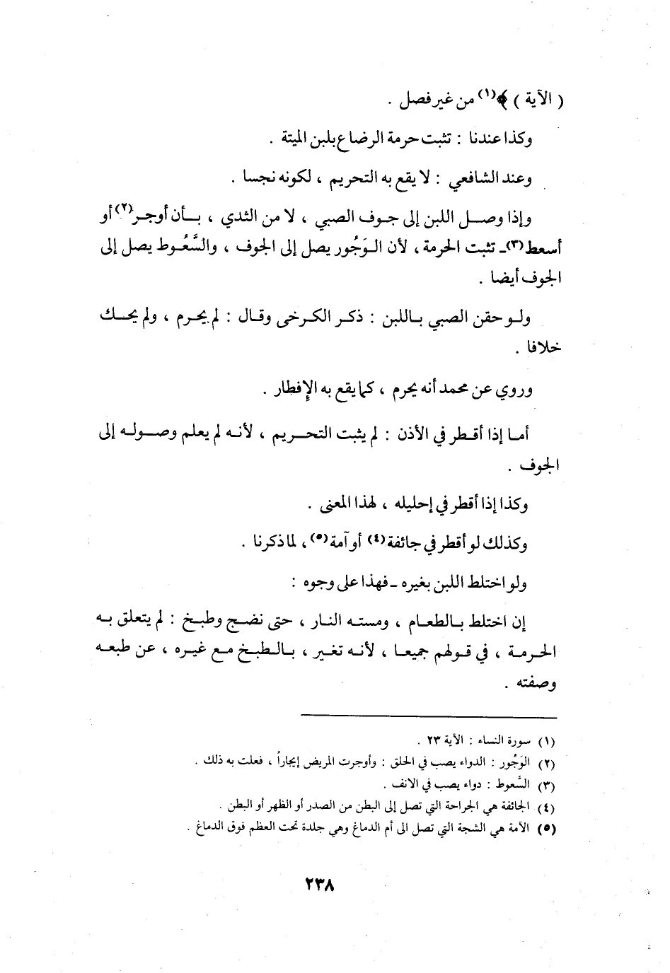 وَلَو اخْتَلَط اللَّبن بِغَيْرِهِ فَهَذَا على وُجُوه إِن اخْتَلَط بِالطَّعَامِ ومسته النَّار حَتَّى نضج وطبخ لم يتَعَلَّق بِهِ الْحُرْمَة فِي قَوْلهم جَمِيعًا لِأَنَّهُ تغير بالطبخ مَعَ غَيره عَن طبعه وَصفته