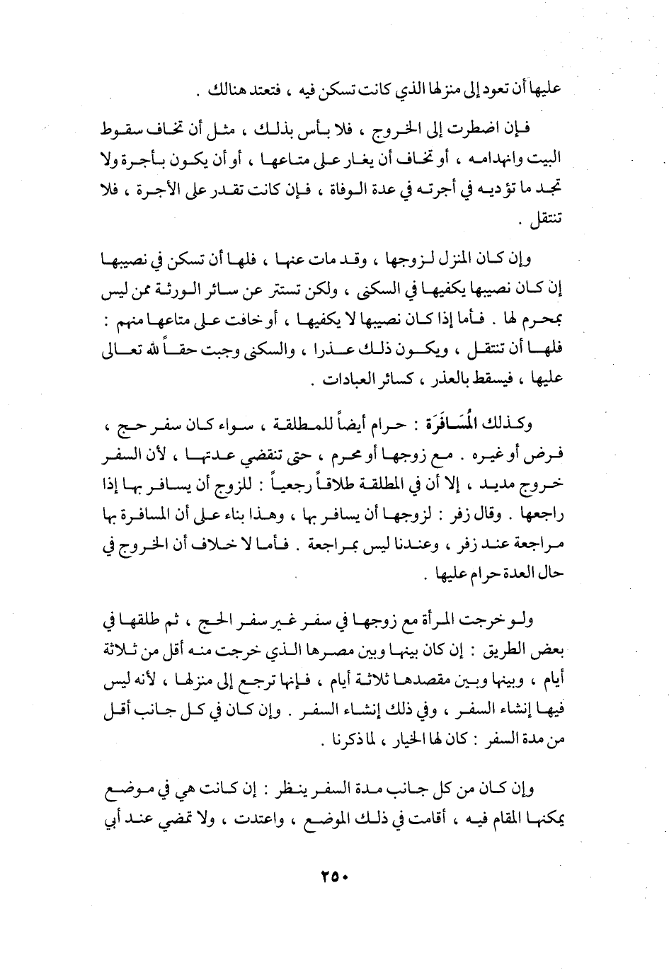 مَعَ زَوجهَا أَو محرم حَتَّى تَنْقَضِي عدتهَا لِأَن السّفر خُرُوج مديد إِلَّا أَن فِي الْمُطلقَة طَلَاقا رَجْعِيًا للزَّوْج أَن يُسَافر بهَا إِذا رَاجعهَا