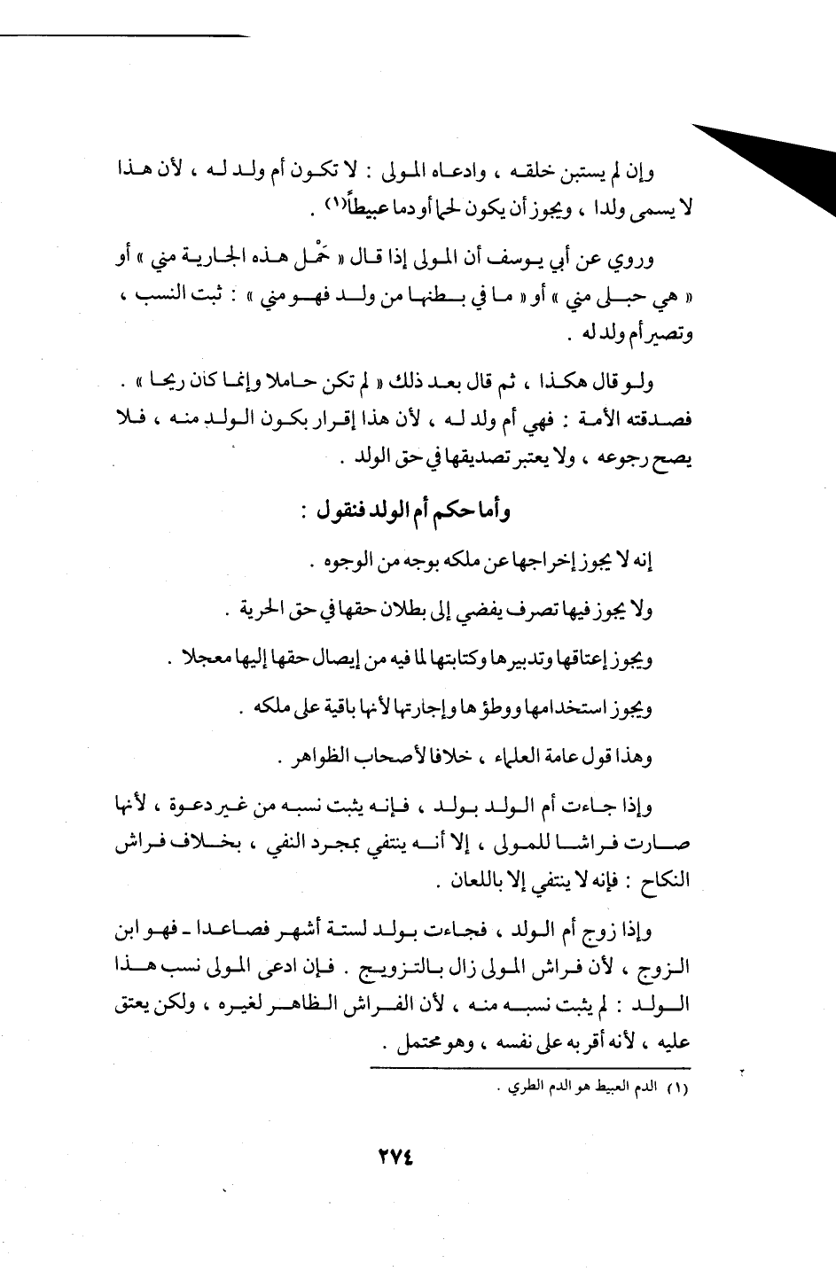 وَإِذا جَاءَت أم الْوَلَد بِولد فَإِنَّهُ يثبت نسبه من غير دَعْوَة لِأَنَّهَا صَارَت فراشا للْمولى إِلَّا أَنه يَنْتَفِي بِمُجَرَّد النَّفْي بِخِلَاف فرَاش النِّكَاح فَإِنَّهُ لَا يَنْتَفِي إِلَّا بِاللّعانِ