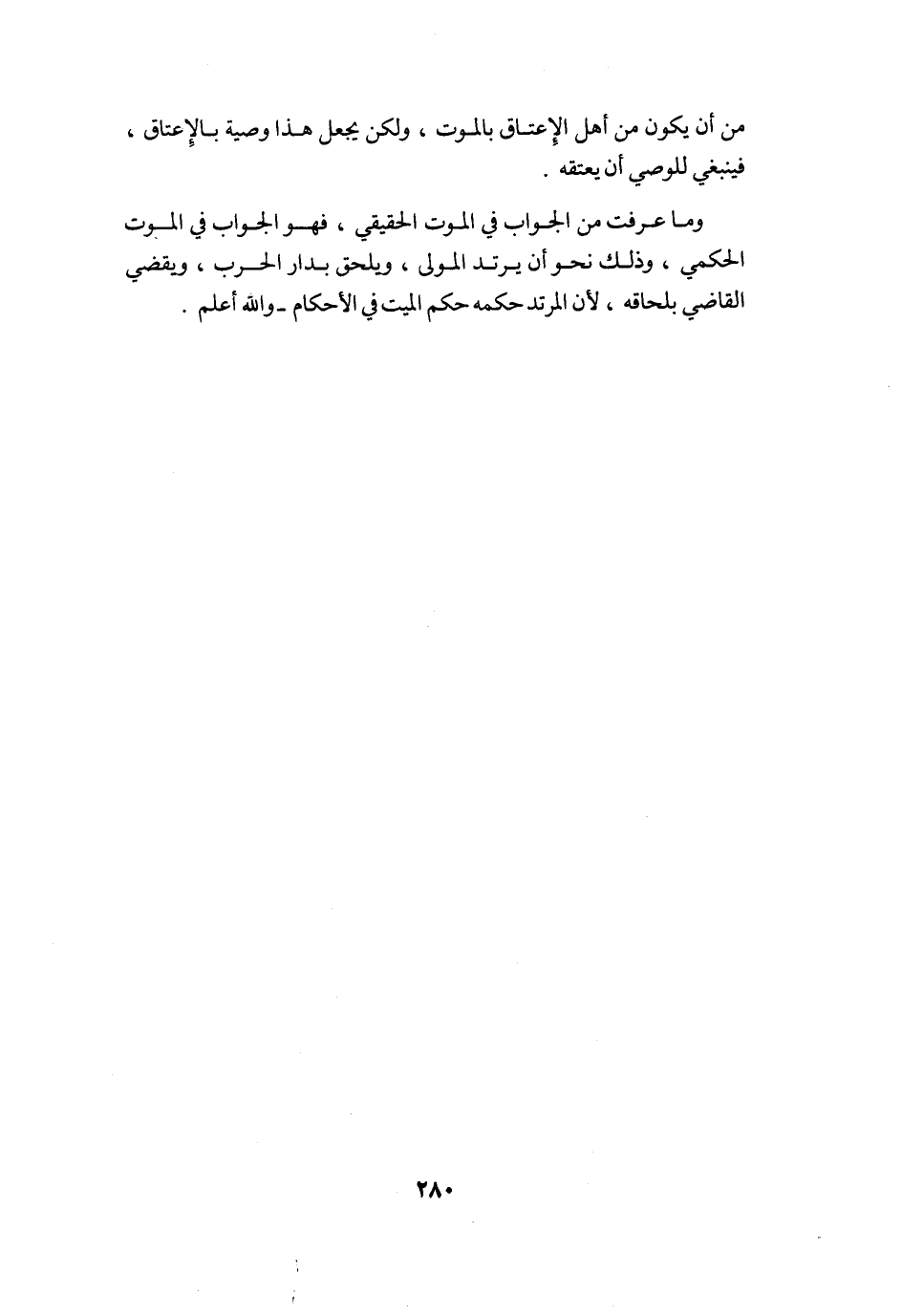 وَمَا عرفت من الْجَواب فِي الْمَوْت الْحَقِيقِيّ فَهُوَ الْجَواب فِي الْمَوْت الْحكمِي وَذَلِكَ نَحْو أَن يرْتَد الْمولى وَيلْحق بدار الْحَرْب وَيَقْضِي القَاضِي بلحاقه لِأَن الْمُرْتَد حكمه حكم الْمَيِّت فِي الْأَحْكَام وَالله أعلم