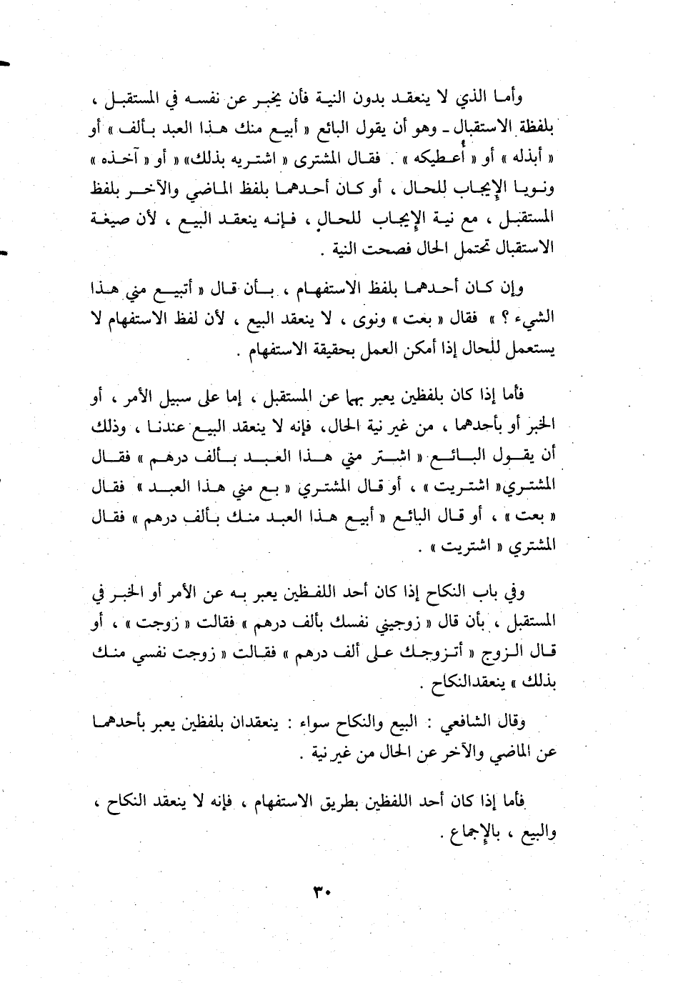 فَأَما إِذا كَانَ بلفظين يعبر بهما عَن الْمُسْتَقْبل إِمَّا على سَبِيل الْأَمر أَو الْخَبَر أَو بِأَحَدِهِمَا من غير نِيَّة الْحَال فَإِنَّهُ لَا ينْعَقد البيع عندنَا وَذَلِكَ أَن يَقُول البَائِع اشْتَرِ مني هَذَا العَبْد بِأَلف دِرْهَم فَقَالَ المُشْتَرِي اشْتريت أَو قَالَ المُشْتَرِي بِعْ مني هَذَا العَبْد فَقَالَ بِعْت أَو قَالَ البَائِع أبيع هَذَا العَبْد مِنْك بِأَلف دِرْهَم فَقَالَ المُشْتَرِي اشْتريت