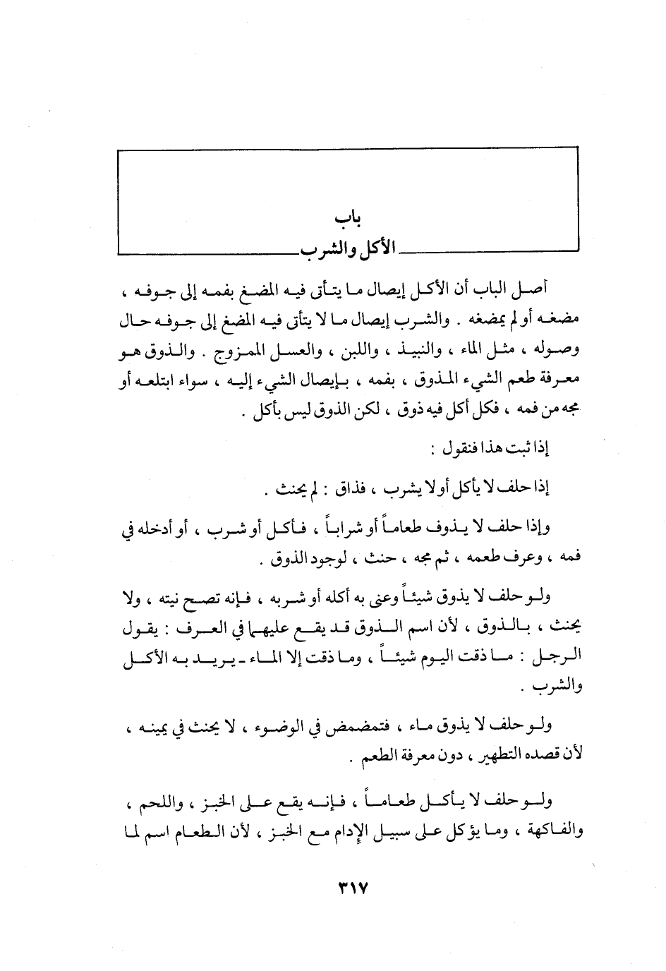 وَلَو حلف لَا يَذُوق شَيْئا وعنى بِهِ أكله أَو شربه فَإِنَّهُ تصح نِيَّته وَلَا يَحْنَث بالذوق لِأَن اسْم الذَّوْق قد يَقع عَلَيْهِمَا فِي الْعرف يَقُول الرجل مَا ذقت الْيَوْم شَيْئا وَمَا ذقت إِلَّا المَاء يُرِيد بِهِ الْأكل وَالشرب