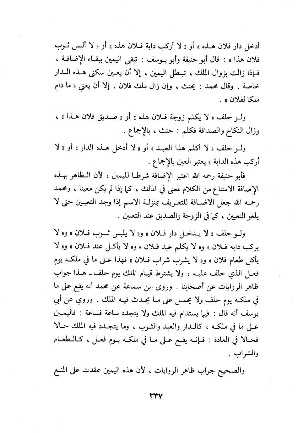 وَلَو حلف لَا يدْخل دَار فلَان وَلَا يلبس ثوب فلَان وَلَا يركب دَابَّة فلَان وَلَا يكلم عبد فلَان وَلَا يَأْكُل عِنْد فلَان وَلَا يَأْكُل طَعَام فلَان وَلَا يشرب شراب فلَان فَهَذَا على مَا فِي ملكه يَوْم فعل الَّذِي حلف عَلَيْهِ وَلَا يشْتَرط قيام الْملك يَوْم حلف هَذَا جَوَاب ظَاهر الرِّوَايَات عَن أَصْحَابنَا