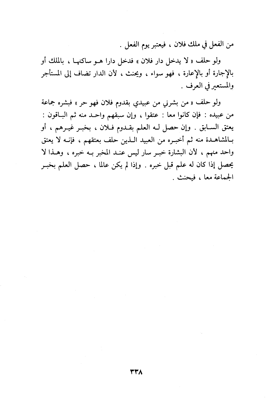 وَإِن حصل لَهُ الْعلم بقدوم فلَان بِخَبَر غَيرهم أَو بِالْمُشَاهَدَةِ مِنْهُ ثمَّ أخبرهُ من العبيد الَّذين حلف بعتقهم فَإِنَّهُ لَا يعْتق وَاحِد مِنْهُم لِأَن الْبشَارَة خبر سَار لَيْسَ عِنْد الْمخبر بِهِ خَبره وَهَذَا لَا يحصل إِذا كَانَ لَهُ علم قبل خَبره