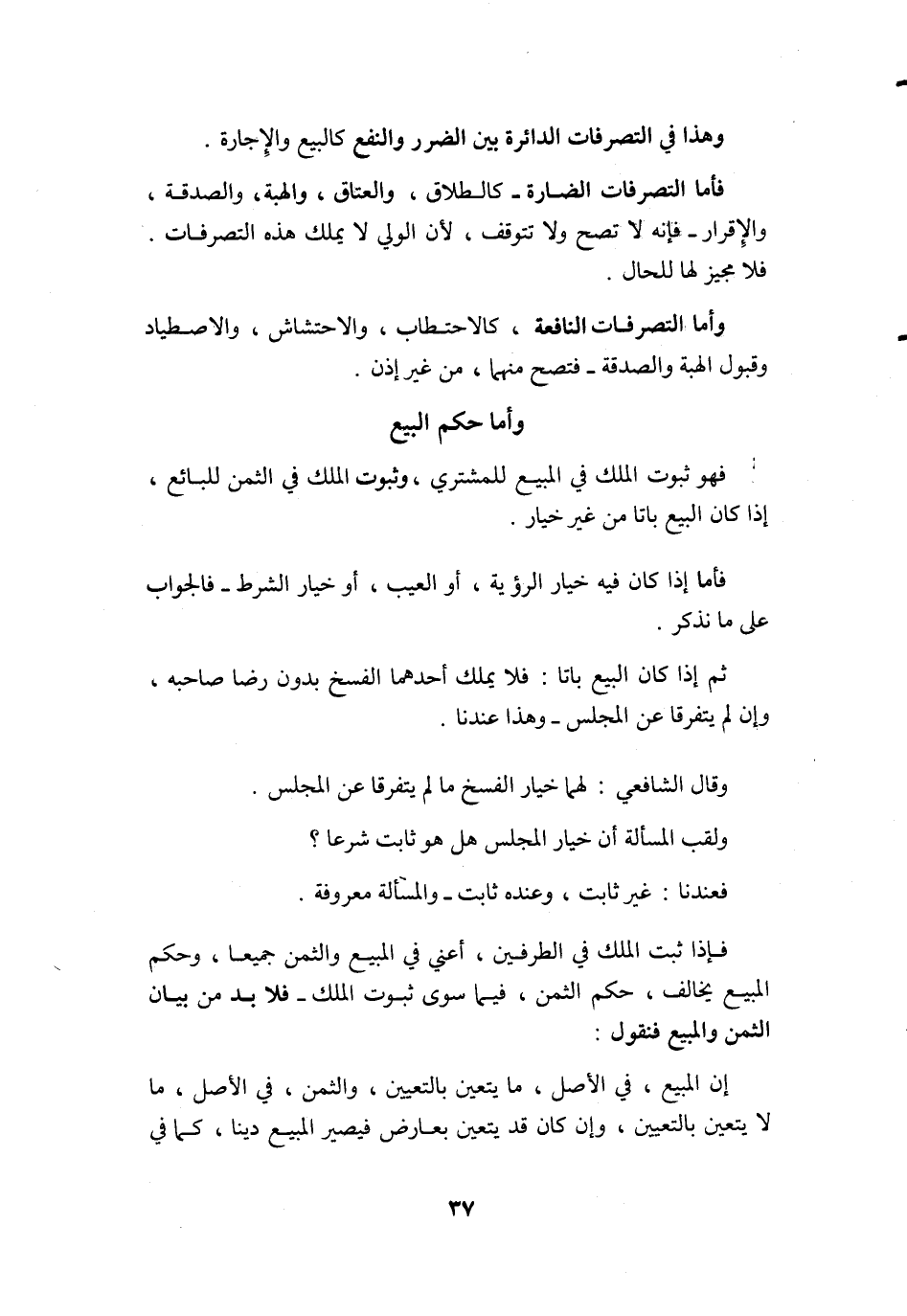 فَهُوَ ثُبُوت الْملك فِي الْمَبِيع للْمُشْتَرِي وَثُبُوت الْملك فِي الثّمن للْبَائِع إِذا كَانَ البيع باتا من غير خِيَار فَأَما إِذا كَانَ فِيهِ خِيَار الرُّؤْيَة أَو الْعَيْب أَو خِيَار الشَّرْط فَالْجَوَاب على مَا نذْكر ثمَّ إِذا كَانَ البيع باتا فَلَا يملك أَحدهمَا الْفَسْخ بِدُونِ رضَا صَاحبه وَإِن لم يَتَفَرَّقَا عَن الْمجْلس وَهَذَا عندنَا وَقَالَ الشَّافِعِي: لَهما خِيَار الْفَسْخ مَا لم يَتَفَرَّقَا عَن الْمجْلس ولقب الْمَسْأَلَة أَن خِيَار الْمجْلس هَل هُوَ ثَابت شرعا فعندنا غير ثَابت وَعِنْده ثَابت وَالْمَسْأَلَة مَعْرُوفَة فَإِذا ثَبت الْملك فِي الطَّرفَيْنِ أَعنِي فِي الْمَبِيع وَالثمن جَمِيعًا وَحكم الْمَبِيع يُخَالف حكم الثّمن فِيمَا سوى ثُبُوت الْملك فَلَا بُد من بَيَان الثّمن وَالْمَبِيع فَنَقُول: إِن الْمَبِيع فِي الأَصْل مَا يتَعَيَّن بِالتَّعْيِينِ وَالثمن فِي الأَصْل مَا لَا يتَعَيَّن بِالتَّعْيِينِ وَإِن كَانَ قد يتَعَيَّن بِعَارِض فَيصير الْمَبِيع دينا كَمَا فِي