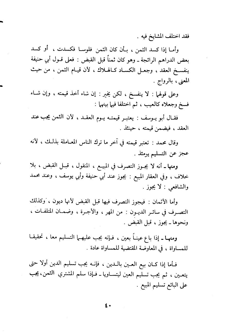 فقد اخْتلف الْمَشَايِخ فِيهِ وَأما إِذا كسد الثّمن بِأَن كَانَ الثّمن فُلُوسًا فكسدت أَو كسد بعض الدَّرَاهِم الرائجة وَهُوَ كَانَ ثمنا قبل الْقَبْض فعلى قَول أبي حنيفَة يَنْفَسِخ العقد وَجعل الكساد كالهلاك لِأَن قيام الثّمن من حَيْثُ الْمَعْنى بالرواج وعَلى قَوْلهمَا: لَا يَنْفَسِخ لَكِن يُخَيّر إِن شَاءَ أَخذ قِيمَته وَإِن شَاءَ فسخ وجعلاه كالعيب ثمَّ اخْتلفَا فِيمَا بَينهمَا فَقَالَ أَبُو يُوسُف: يعْتَبر قِيمَته يَوْم العقد لِأَن الثّمن يجب عِنْد العقد فَيضمن قِيمَته حِينَئِذٍ وَقَالَ مُحَمَّد: تعْتَبر قِيمَته فِي آخر مَا ترك النَّاس الْمُعَامَلَة بذلك لِأَنَّهُ عجز عَن التَّسْلِيم يَوْمئِذٍ وَمِنْهَا: أَنه لَا يجوز التَّصَرُّف فِي الْمَبِيع الْمَنْقُول قبل الْقَبْض بِلَا خلاف وَفِي الْعقار الْمَبِيع يجوز عِنْد أبي حنيفَة وَأبي يُوسُف وَعند مُحَمَّد وَالشَّافِعِيّ لَا يجوز وَأما الْأَثْمَان فَيجوز التَّصَرُّف فِيهَا قبل الْقَبْض لِأَنَّهَا دُيُون وَكَذَلِكَ التَّصَرُّف فِي سَائِر الدُّيُون من الْمهْر وَالْأُجْرَة وَضَمان الْمُتْلفَات وَنَحْوهَا يجوز قبل الْقَبْض وَمِنْهَا: إِذا بَاعَ عينا بِعَين فَإِنَّهُ يجب عَلَيْهِمَا التَّسْلِيم مَعًا تَحْقِيقا للمساواة فِي الْمُعَاوضَة الْمُقْتَضِيَة للمساواة عَادَة فَأَما إِذا كَانَ بيع الْعين بِالدّينِ فَإِنَّهُ يجب تَسْلِيم الدّين أَولا حَتَّى يتَعَيَّن ثمَّ يجب تَسْلِيم الْعين ليتساويا فَإِذا سلم المُشْتَرِي الثّمن يجب على البَائِع تَسْلِيم الْمَبِيع
