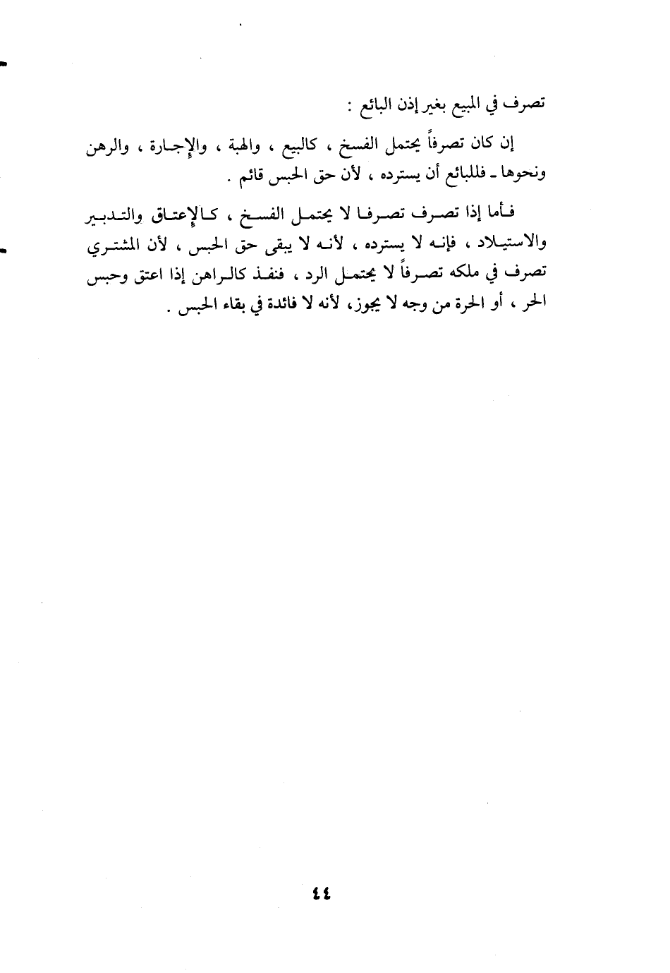 فَأَما إِذا تصرف تَصرفا لَا يحْتَمل الْفَسْخ كالإعتاق وَالتَّدْبِير وَالِاسْتِيلَاد فَإِنَّهُ لَا يسْتَردّهُ لِأَنَّهُ لَا يبْقى حق الْحَبْس لِأَن المُشْتَرِي تصرف فِي ملكه تَصرفا لَا يحْتَمل الرَّد فنفذ كالراهن إِذا أعتق وَحبس الْحر أَو الْحرَّة من وَجه لَا يجوز لِأَنَّهُ لَا فَائِدَة فِي بَقَاء الْحَبْس