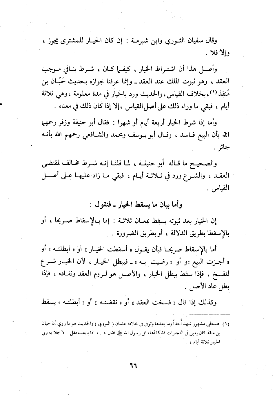 وَأما بَيَان مَا يسْقط الْخِيَار فَنَقُول إِن الْخِيَار بعد ثُبُوته يسْقط بمعان ثَلَاثَة إِمَّا بالإسقاط صَرِيحًا أَو بالإسقاط بطرِيق الدّلَالَة أَو بطرِيق الضَّرُورَة