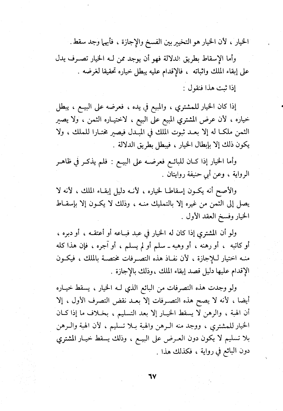وَأما الْإِسْقَاط بطرِيق الدّلَالَة فَهُوَ أَن يُوجد مِمَّن لَهُ الْخِيَار تصرف يدل على إبْقَاء الْملك وإثباته فالإقدام عَلَيْهِ يبطل خِيَاره تَحْقِيقا لغرضه