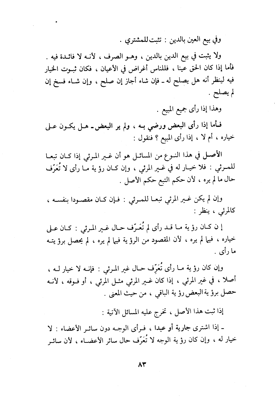 إِذا ثَبت هَذَا الأَصْل تخرج عَلَيْهِ الْمسَائِل الْآتِيَة إِذا اشْترى جَارِيَة أَو عبدا فَرَأى الْوَجْه دون سَائِر الْأَعْضَاء لَا خِيَار لَهُ وَإِن كَانَ رُؤْيَة الْوَجْه لَا تعرف حَال سَائِر الْأَعْضَاء لِأَن سَائِر