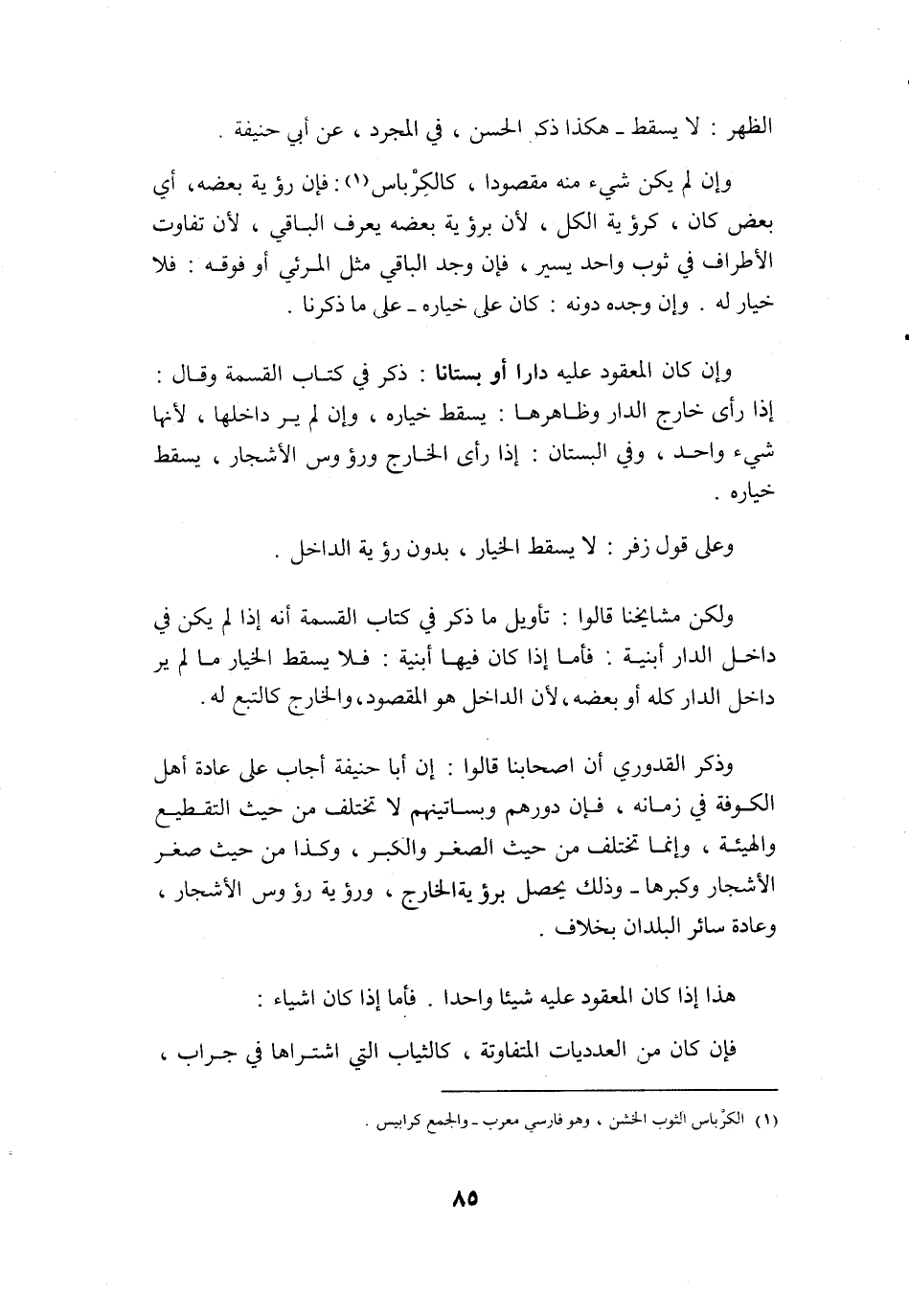 وَذكر الْقَدُورِيّ أَن أَصْحَابنَا قَالُوا إِن أَبَا حنيفَة أجَاب على عَادَة أهل الْكُوفَة فِي زَمَانه فَإِن دُورهمْ وبساتينهم لَا تخْتَلف من حَيْثُ التقطيع والهيئة وَإِنَّمَا تخْتَلف من حَيْثُ الصغر وَالْكبر وَكَذَا من حَيْثُ صغر الْأَشْجَار وكبرها وَذَلِكَ يحصل بِرُؤْيَة الْخَارِج ورؤية رُؤُوس الْأَشْجَار وَعَادَة سَائِر الْبلدَانِ بِخِلَاف