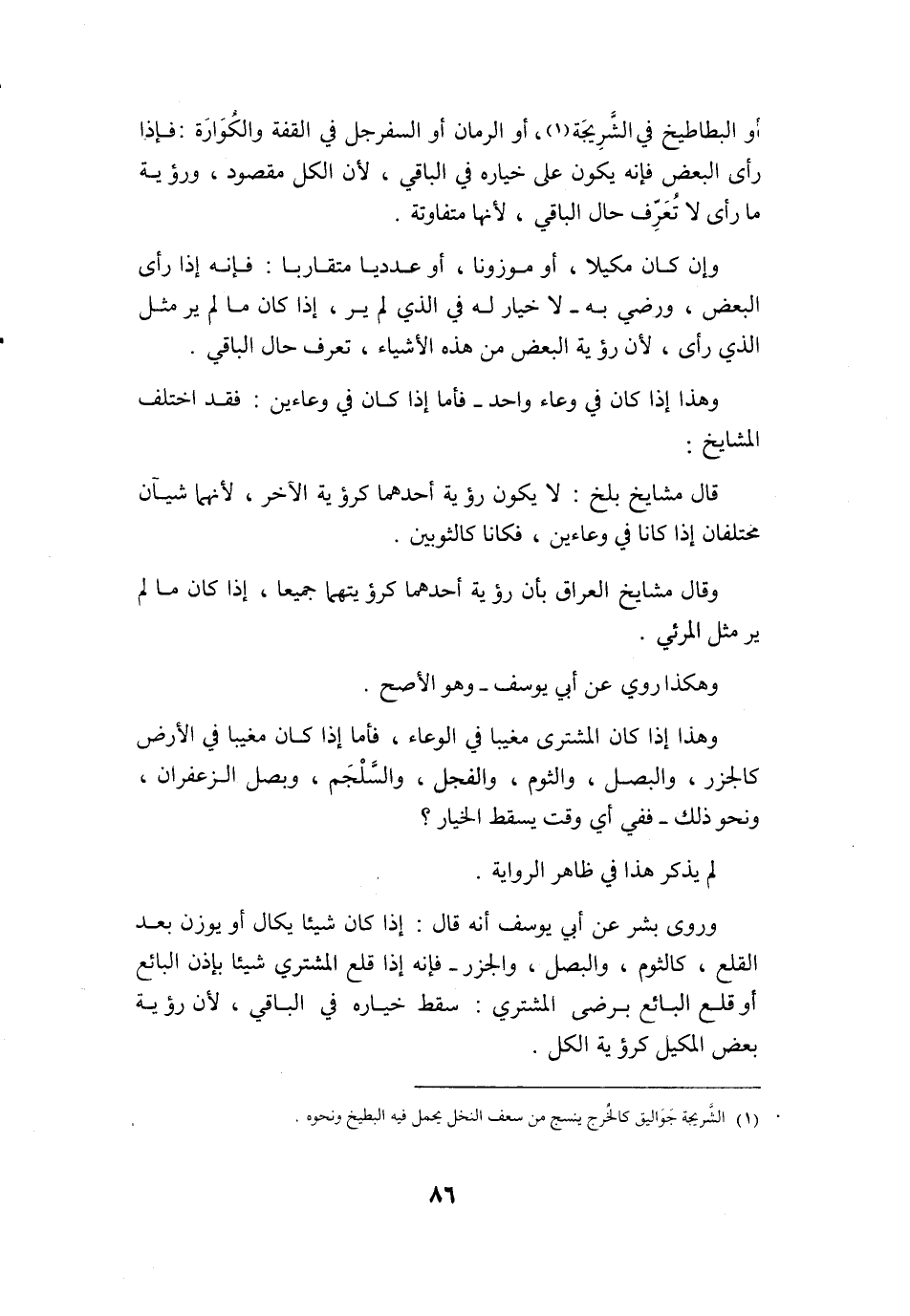 وروى بشر عَن أبي يُوسُف أَنه قَالَ إِذا كَانَ شَيْئا يُكَال أَو يُوزن بعد الْقلع كالثوم والبصل والجزر فَإِنَّهُ إِذا قلع المُشْتَرِي شَيْئا بِإِذن البَائِع أَو قلع البَائِع برضى المُشْتَرِي سقط خِيَاره فِي الْبَاقِي لِأَن رُؤْيَة بعض الْمكيل كرؤية الْكل