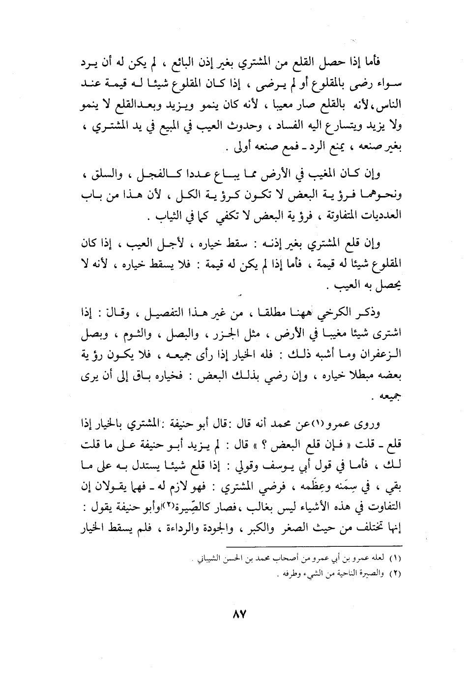 قلت فَإِن قلع الْبَعْض قَالَ لم يزِيد أَبُو حنيفَة على مَا قلت لَك فَأَما فِي قَول أبي يُوسُف وَقَوْلِي إِذا قلع شَيْئا يسْتَدلّ بِهِ على مَا بَقِي فِي سمنه وعظمه فَرضِي المُشْتَرِي فَهُوَ لَازم لَهُ فهما يَقُولَانِ إِن التَّفَاوُت فِي هَذِه الْأَشْيَاء لَيْسَ بغالب فَصَارَ كالصبرة وَأَبُو حنيفَة يَقُول إِنَّهَا تخْتَلف من حَيْثُ الصغر وَالْكبر والجودة والرداءة فَلم يسْقط الْخِيَار