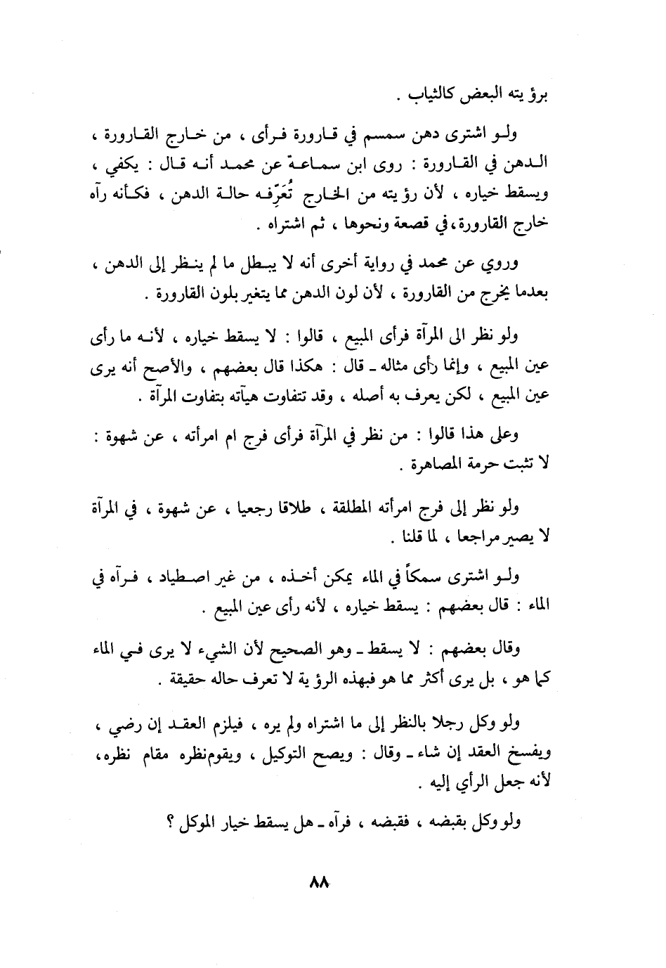 وَلَو اشْترى دهن سمسم فِي قَارُورَة فَرَأى من خَارج القارورة الدّهن فِي القارورة روى ابْن سَمَّاعَة عَن مُحَمَّد أَنه قَالَ يَكْفِي وَيسْقط خِيَاره لِأَن رُؤْيَته من الْخَارِج تعرفه حَالَة الدّهن فَكَأَنَّهُ رَآهُ خَارج القارورة فِي قَصْعَة وَنَحْوهَا ثمَّ اشْتَرَاهُ