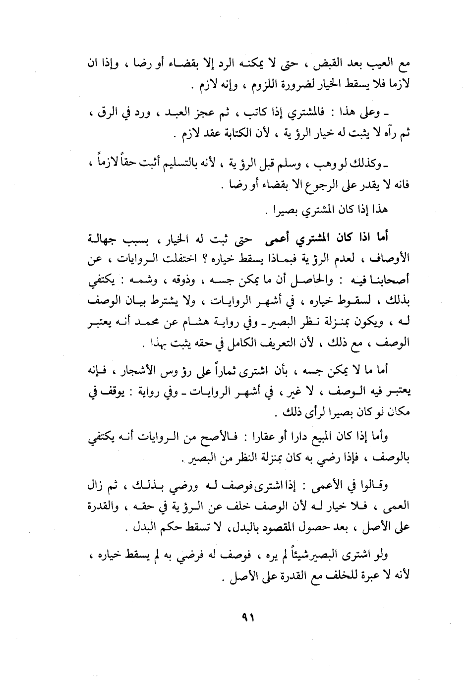 هَذَا إِذا كَانَ المُشْتَرِي بَصيرًا أما إِذا كَانَ المُشْتَرِي أعمى حَتَّى ثَبت لَهُ الْخِيَار بِسَبَب جَهَالَة الْأَوْصَاف لعدم الرُّؤْيَة فبماذا يسْقط خِيَاره اخْتلفت الرِّوَايَات عَن أَصْحَابنَا فِيهِ وَالْحَاصِل أَن مَا يُمكن جسه وذوقه وَشمه يَكْتَفِي بذلك لسُقُوط خِيَاره فِي أشهر الرِّوَايَات وَلَا يشْتَرط بَيَان الْوَصْف لَهُ وَيكون بِمَنْزِلَة نظر الْبَصِير وَفِي رِوَايَة هِشَام عَن مُحَمَّد أَنه يعْتَبر الْوَصْف مَعَ ذَلِك لِأَن التَّعْرِيف الْكَامِل فِي حَقه يثبت بِهَذَا