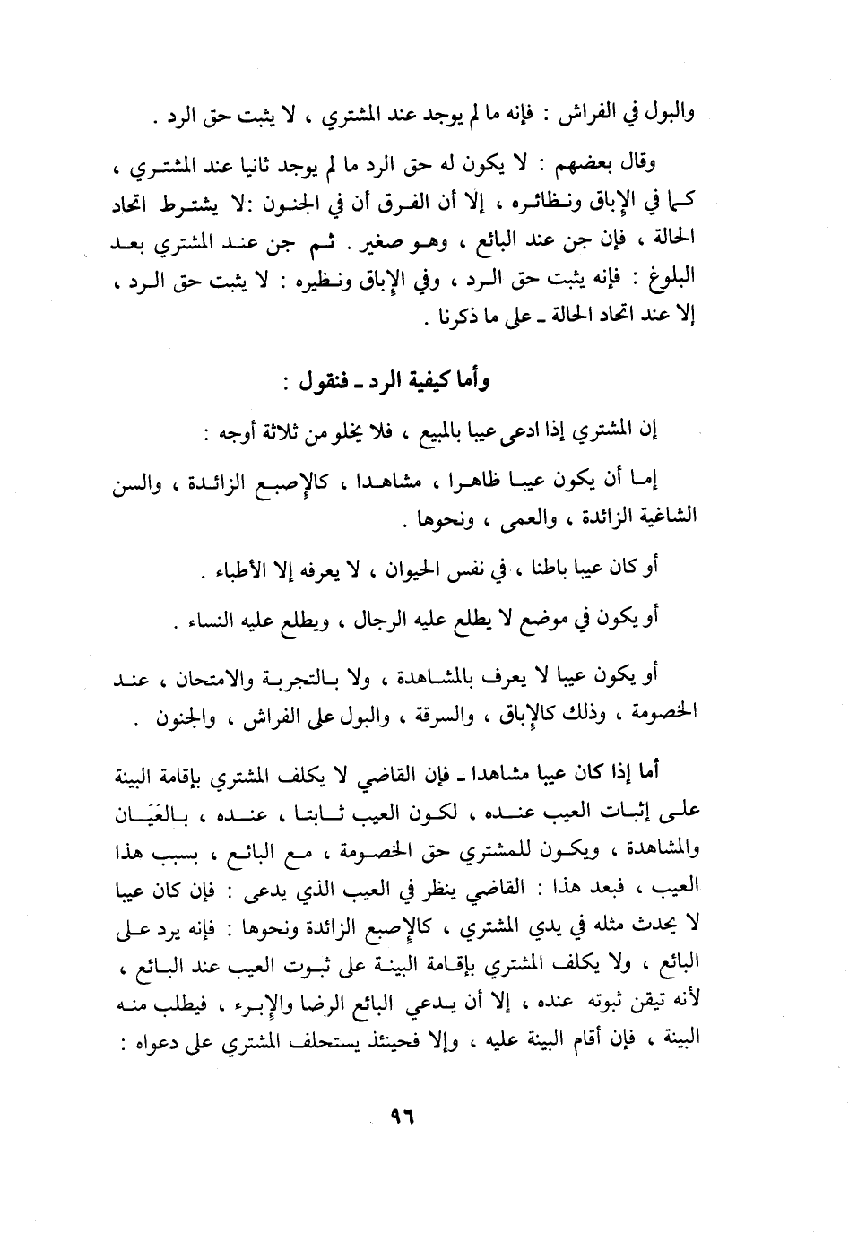 وَأما كَيْفيَّة الرَّد فَنَقُول إِن المُشْتَرِي إِذا ادّعى عَيْبا بِالْمَبِيعِ فَلَا يَخْلُو من ثَلَاثَة أوجه إِمَّا أَن يكون عَيْبا ظَاهرا مشاهدا كالإصبع الزَّائِدَة وَالسّن الشاغية الزَّائِدَة والعمى وَنَحْوهَا