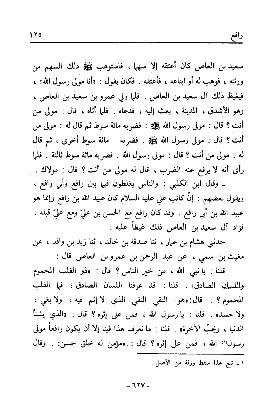 [1] رسم الخط غير واضح ويمكن ان يقرء «قهيز» و «قهز» . وعلم بعد قوله: «عليه» علامة وكتب في الهامش «قميص» . وما صححناه وجدناه موافقا لما ذكره ابن سعد في الطبقات: