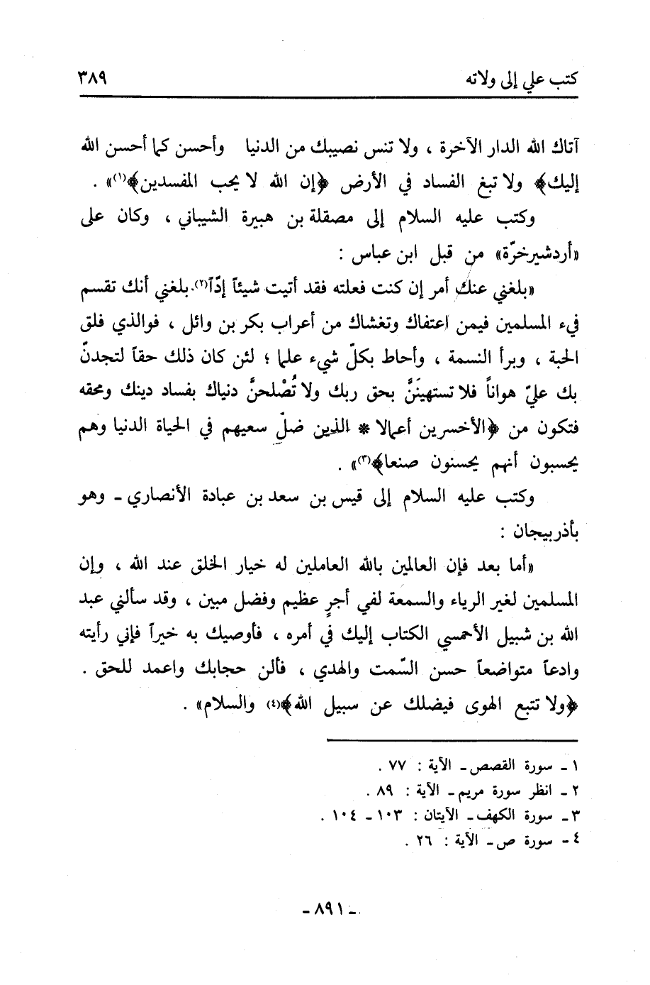 لَمَّا بُويِعَ عَلِيٌّ دَعَا قَيْسَ بْنَ سَعْدٍ الأَنْصَارِيَّ فَوَلَّاهُ الْمَغْرِبَ، فَشَخَصَ إِلَى مِصْرَ وَمَعَهُ أَهْلُ بَيْتِهِ حَتَّى دَخَلَهَا فَقَرَأَ عَلَى أَهْلِهَا كِتَابًا مِنْ عَلِيٍّ إِلَيْهِمْ: ذَكَرَ فِيهِ مُحَمَّدًا صَلَّى اللَّهُ عَلَيْهِ وَسَلَّمَ وَمَا خَصَّهُ اللَّهُ بِهِ مِنْ نُبُوَّتِهِ وَأَنْزَلَ عَلَيْهِ مِنْ كِتَابِهِ وَأَكْرَمَ بِهِ الْمُؤْمِنِينَ مِنْ أَتْبَاعِهِ، ثُمَّ ذَكَرَ أَبَا بَكْرٍ وَعُمَرَ، فَوَصَفَ فَضْلَهُمَا وَعَدَّلَهُمَا وَحَسَّنَ سيرتهما وعلمهما وترحم عليهما (ثم) قَالَ: ثُمَّ وُلِّيَ بَعْدَهُمَا وَالٍ أَحْدَثَ أَحْدَاثًا وَجَدَ النَّاسُ بِهَا عَلَيْهِ مَقَالا، فَلَمَّا نَقَمُوا غيّروا، ثم جاؤني فَبَايَعُونِي فَأَسْتَهْدِي اللَّهَ بِالْهُدَى [2] وَأَسْتَعِينُهُ عَلَى التَّقْوَى. وَأَعْلَمَهُمْ تَوْلِيَتِهِ قَيْسَ بْنِ سَعْدِ بْنِ عُبَادَةَ لِمَا ظَنَّ عِنْدَهُ مِنَ الْخَيْرِ، وَرَجَا مِنْ قَصْدِهِ وَإِيثَارِهِ الْحَقَّ فِي أُمُورِهِ، وَتَقَدُّمِهِ إِلَيْهِ فِي الْعَدْلِ وَالإِحْسَانِ، وَالشِّدَّةِ عَلَى الْمُرِيبِ، وَالرِّفْقِ بالخاصة والعامة،