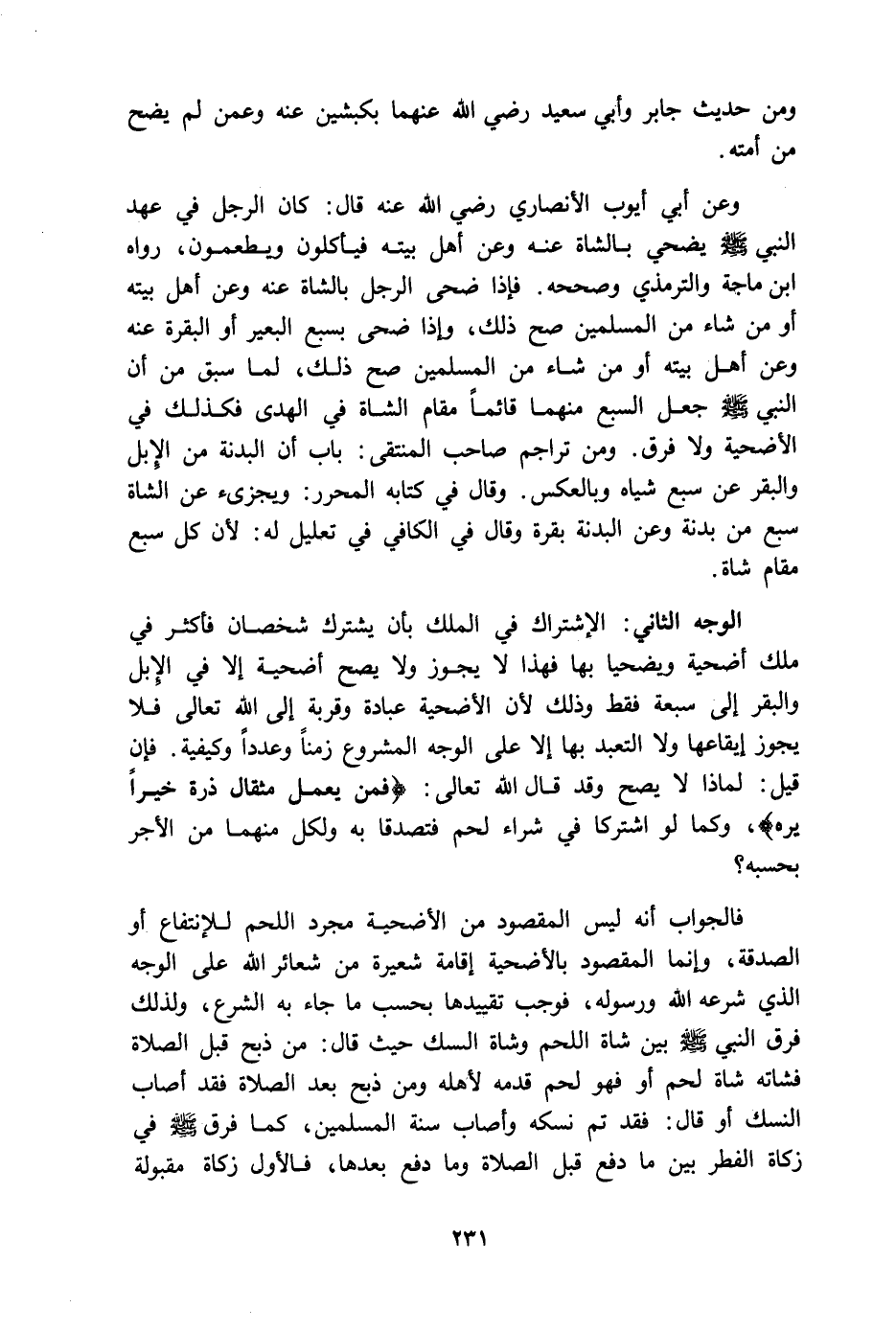 وعن أبي أيوب الأنصاري رضي الله عنه قال: كان الرجل في عهد النبي صلى الله عليه وسلم يضحي بالشاة عنه وعن أهل بيته فيأكلون ويطعمون، رواه ابن ماجه والترمذي وصححه (¬2) .
