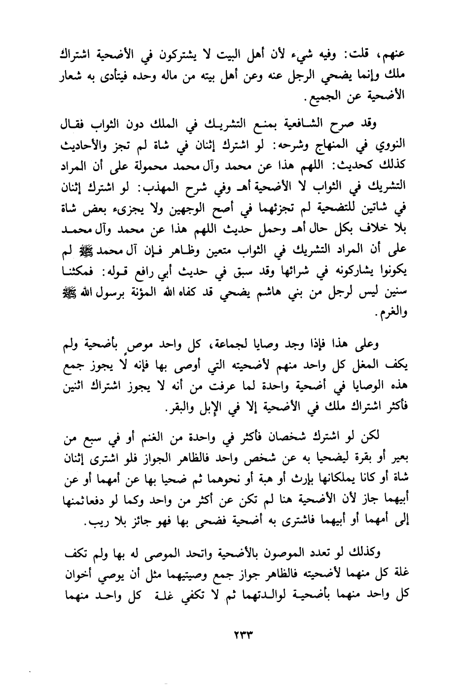 وقد صرح الشافعية بمنع التشريك في الملك دون الثواب فقال النووي في ((المنهاج وشرحه)) : لو اشترك اثنان في شاة لم تجز، والأحاديث كذلك كحديث: ((اللهم هذا عن محمد، وآل محمد)) (¬1) ، على أن المراد التشريك في الثواب لا الأضحية. اهـ.